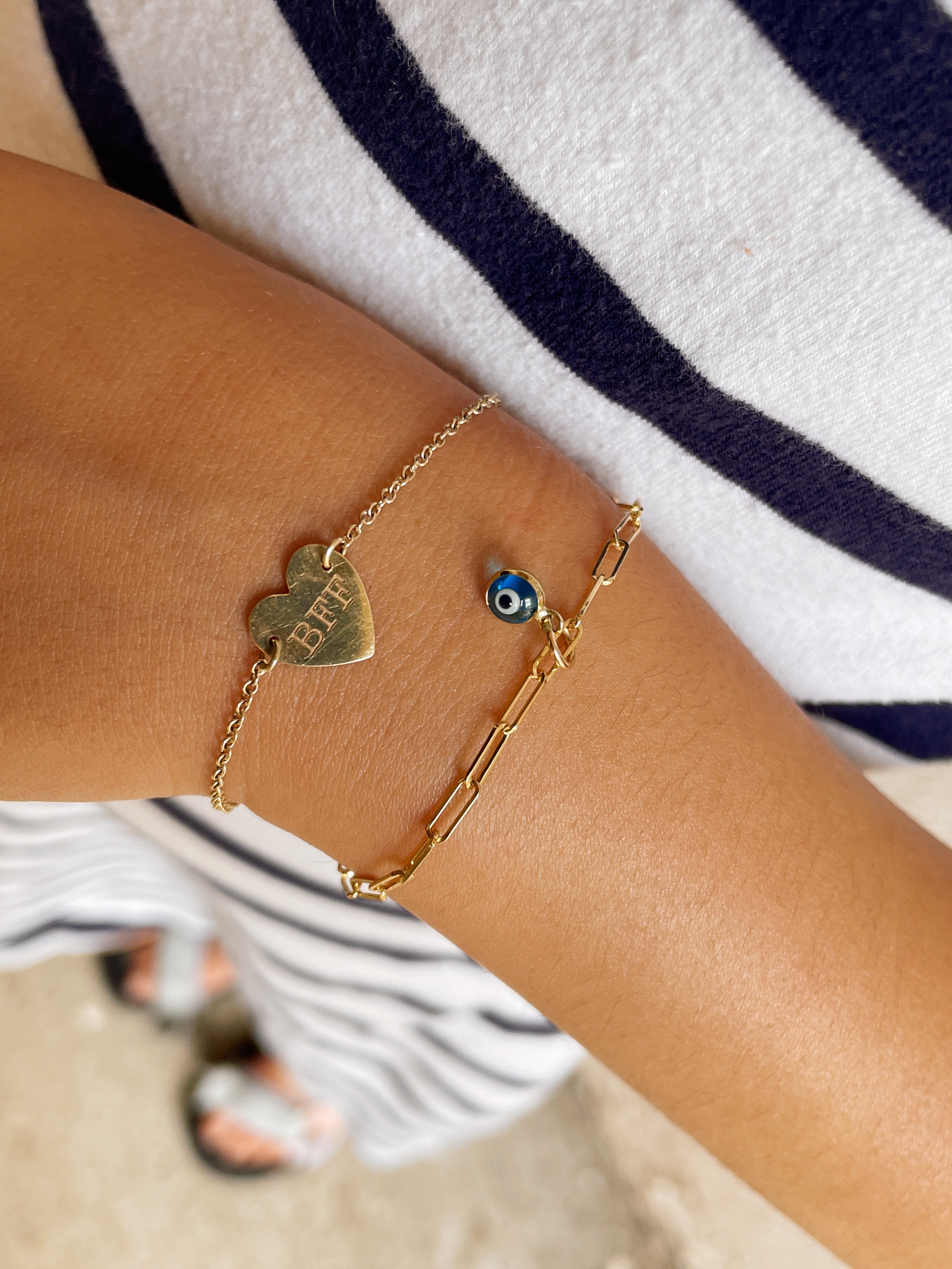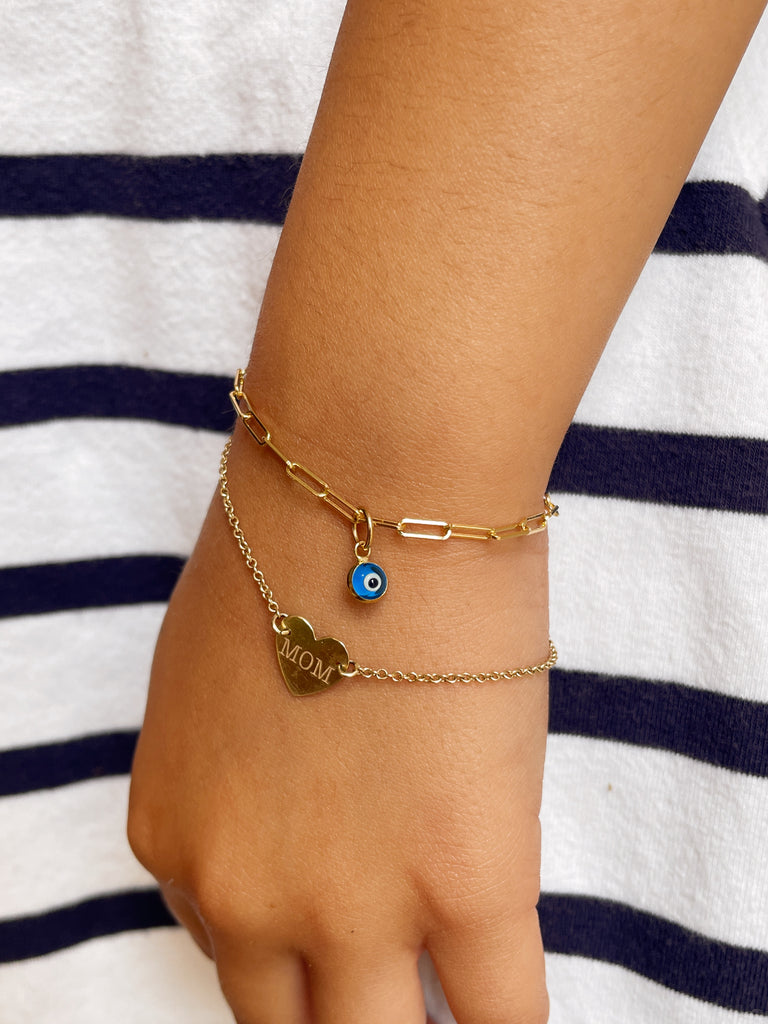 Audrey (7 years old) is wearing the Paperclip Bracelet in the Petite link with the clasp adjusted at 6" and accented with our 14k Mini Mati Charm.