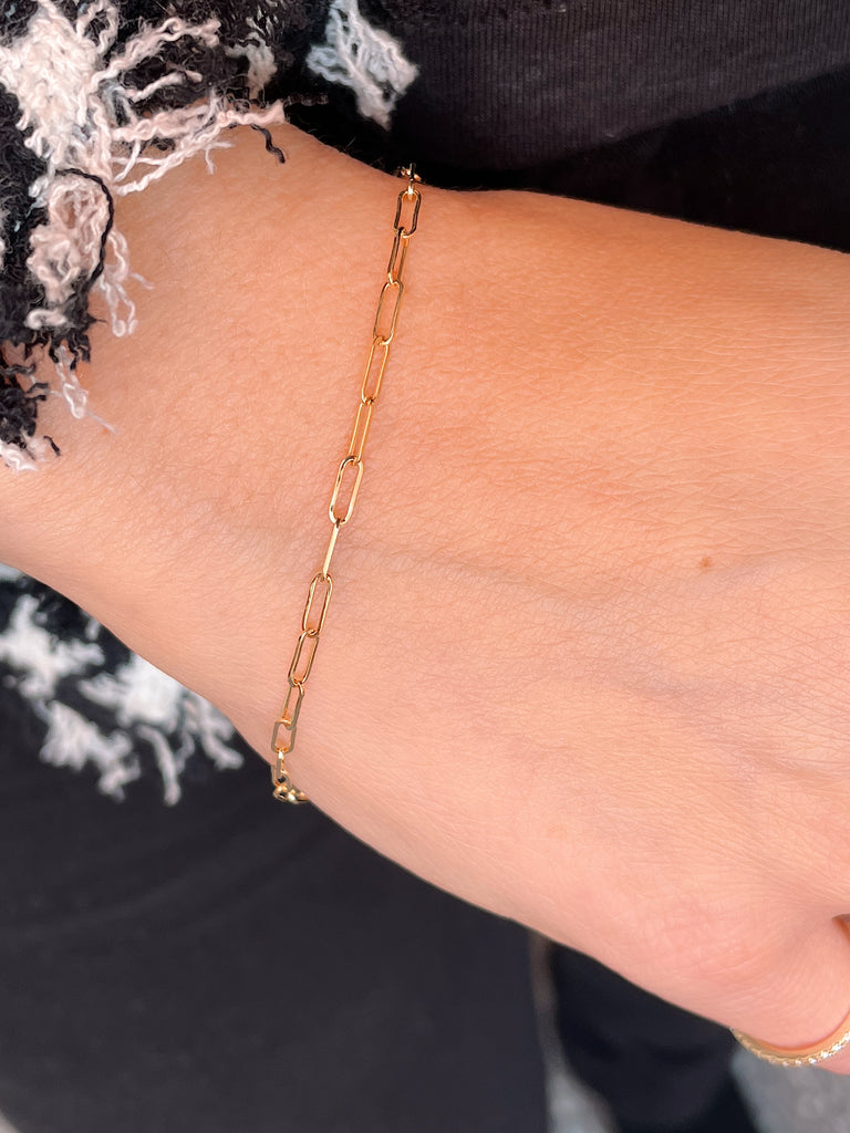 One of our most requested yellow gold bracelets in recent years have been the Paperclip link Bracelet. The Petite gauge consists of 0.5cm solid links and finished with a lobster clasp that can be fastened on any link for a snugger fit.