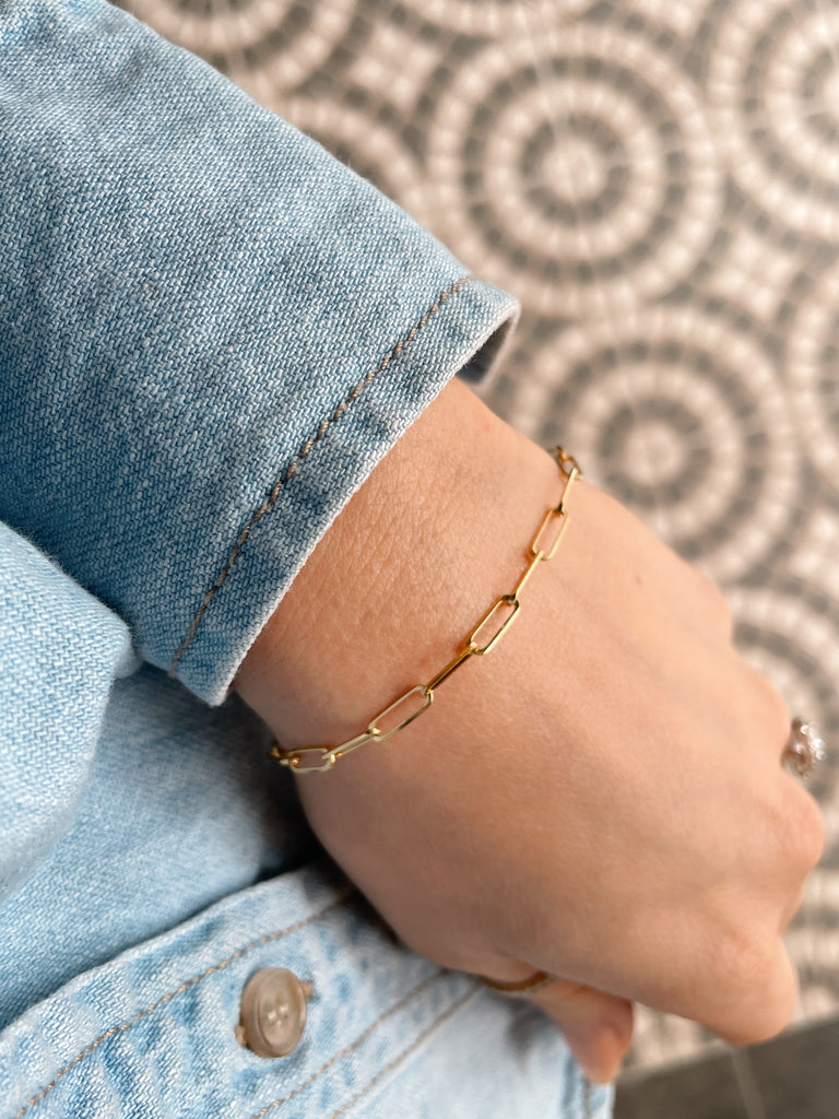 One of our most requested yellow gold bracelets in recent years have been the Paperclip link Bracelet. This Classic gauge consists of 1cm solid link and finished with a lobster clasp that can be fastened on any link for a snugger fit.