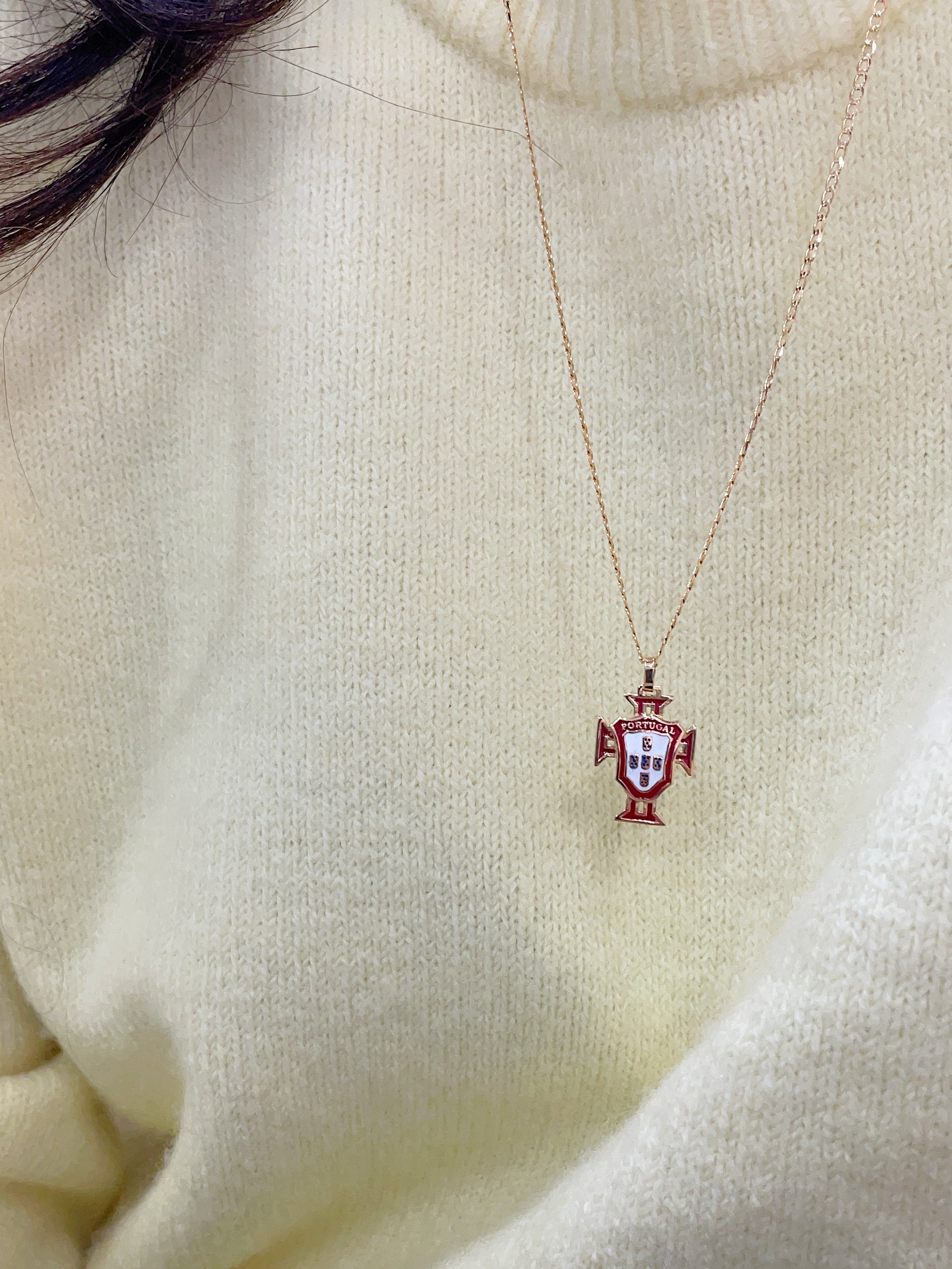 Força Portugal! You may recognize this Portuguese Crest emblem as the red shield worn on the national football team's jersey. Here it is shown with red and white enamel detailing accented with gold borders.
