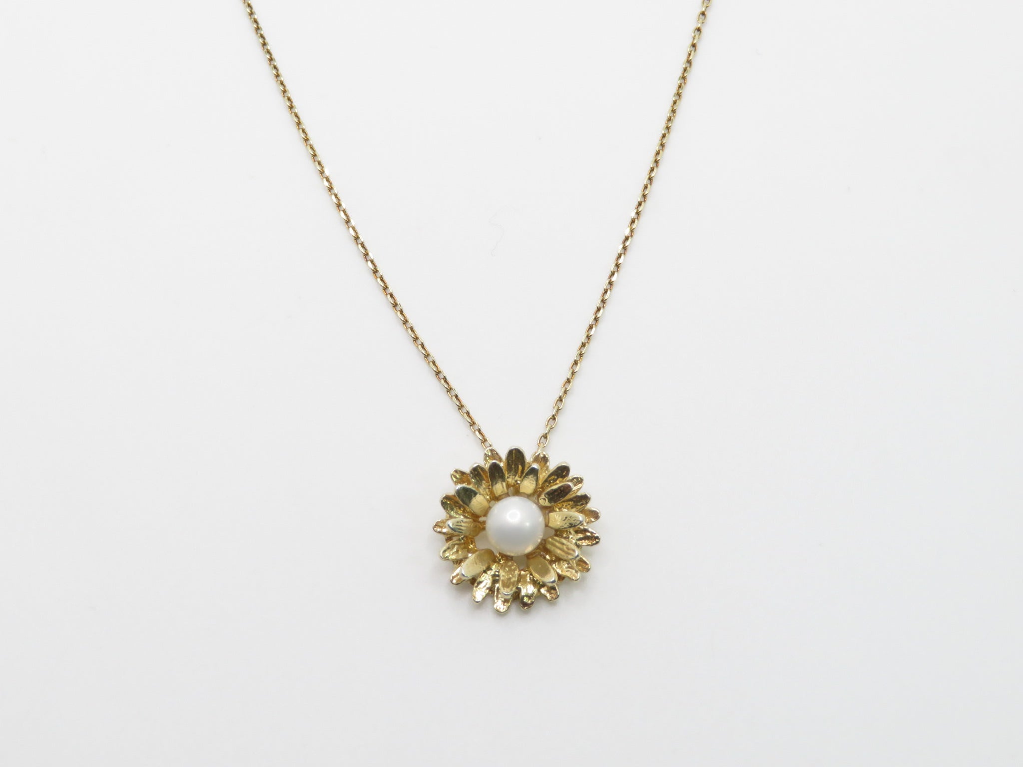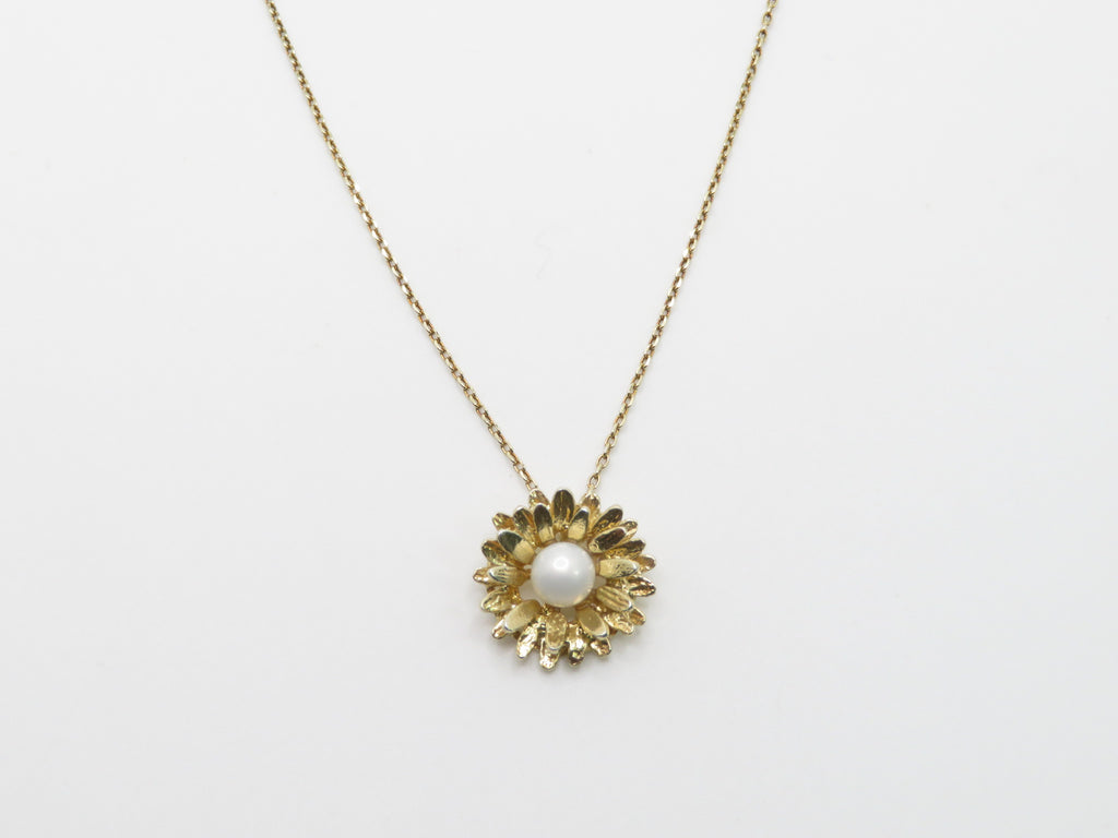 A delicate gold vermeil featuring a floral pendant with a luminous pearl center. Elegant, timeless and effortlessly chic - perfect for both everyday wear and special occasions. Pair it with the matching bracelet and ring to complete the look.