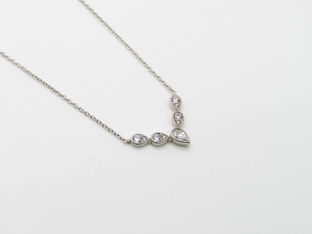 This classic milgrain bezel necklace is the sweetest edition to anyone's jewellery box. Set with pear shaped cubic zirconia for a beautiful sparkle.