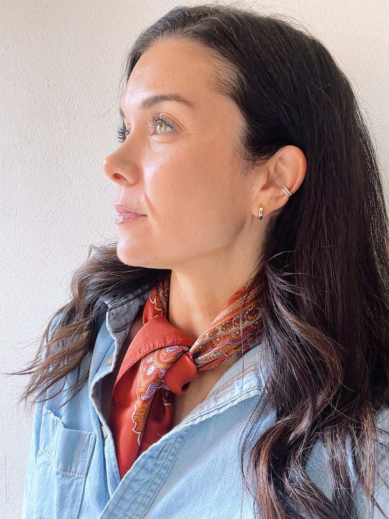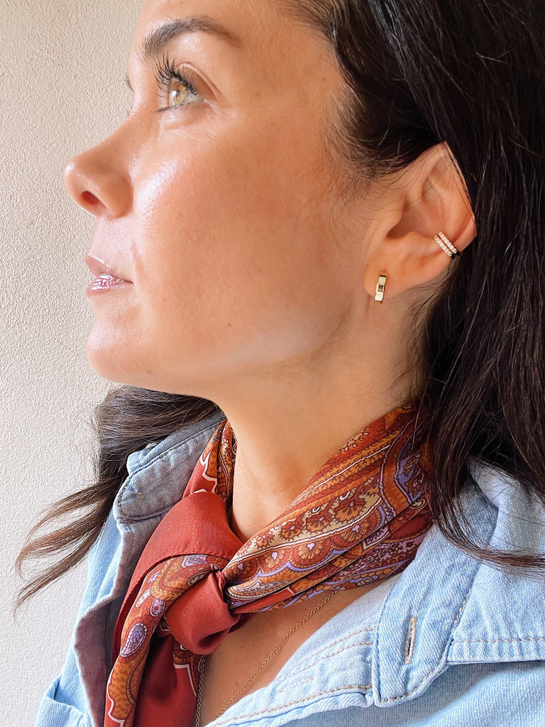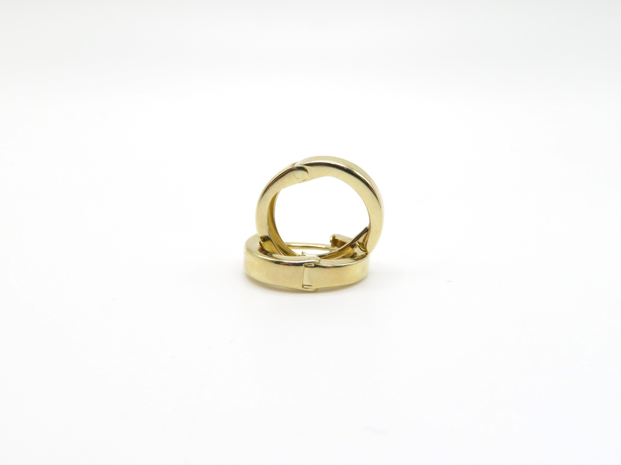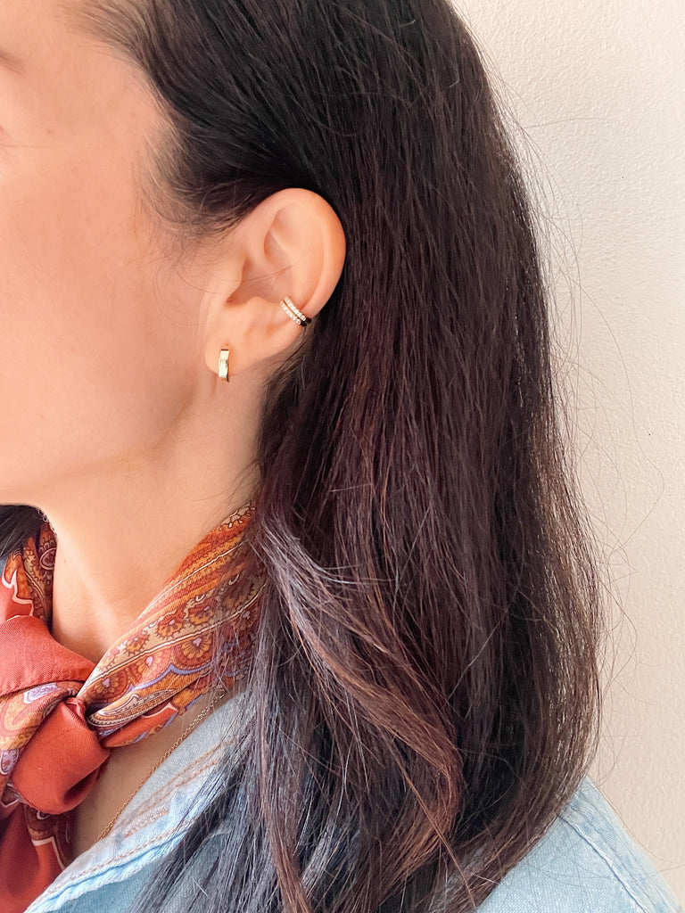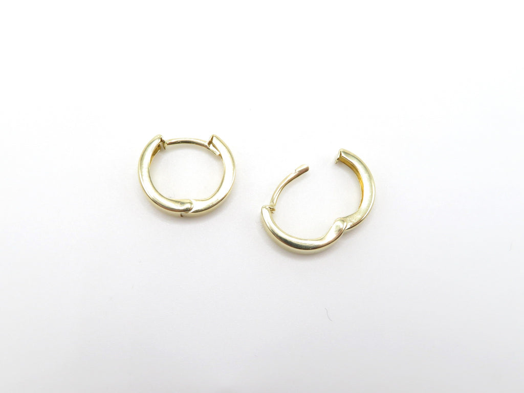 You can't get any more classic than these huggie earrings. The hinged opening not only makes it easy to put on, these earrings allow you to sleep, shower, swim and do whatever you need to. The flat shape make them modern and slightly more substantial than your average huggies.