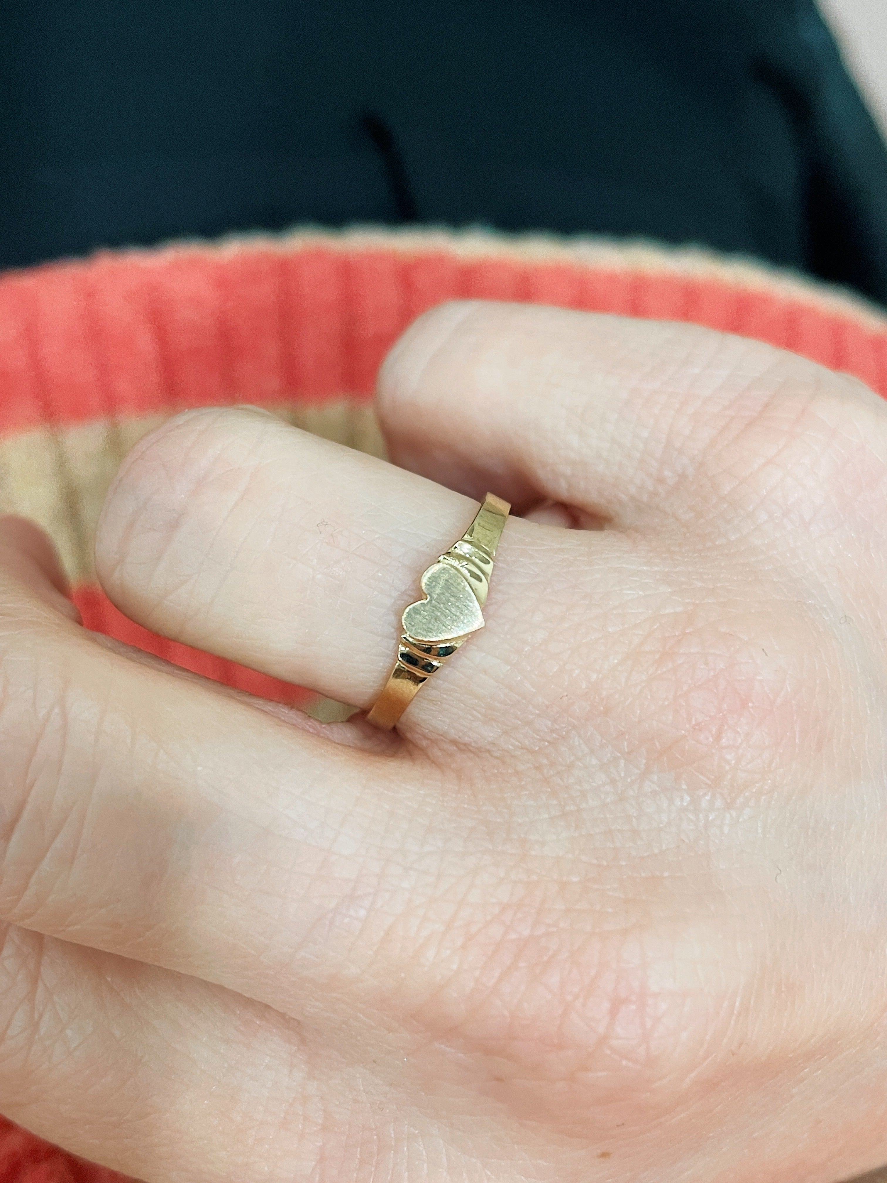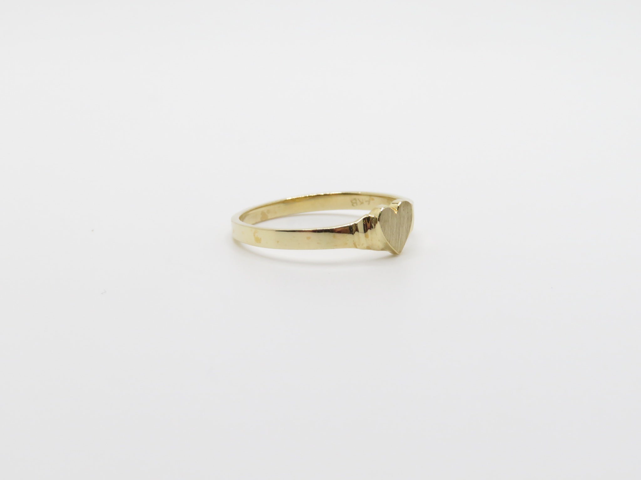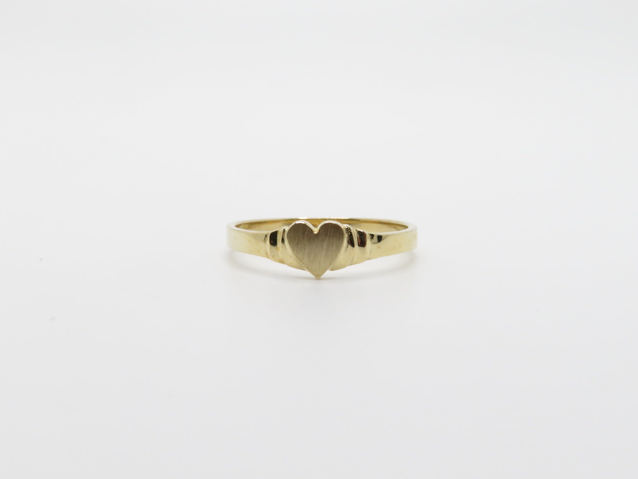 Start them young and accessorize. This charming yellow gold Heart ring is the perfect first ring to introduce to your little one. Made solid and sturdy with everyday wear in mind, this petite signet ring features a delicate heart design. A beautiful keepsake that can be personalized with a small initial engraving. Engraved items are final sale.
