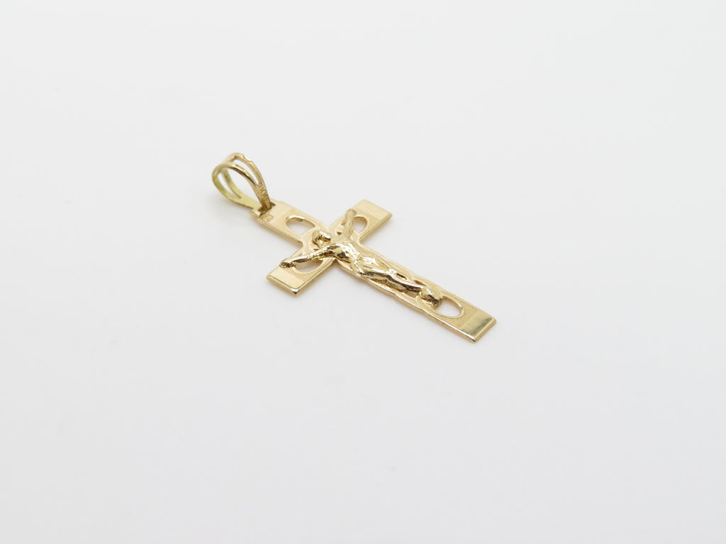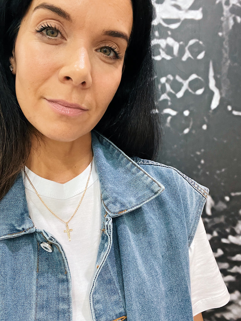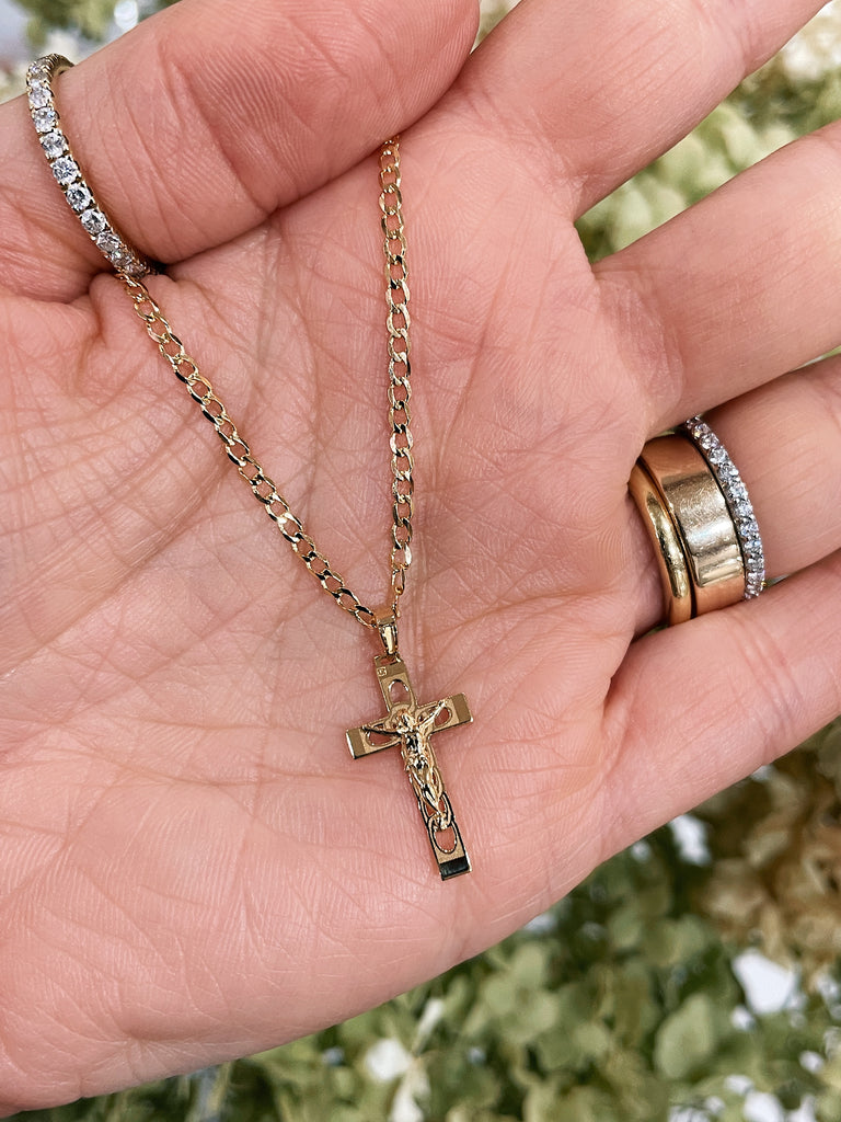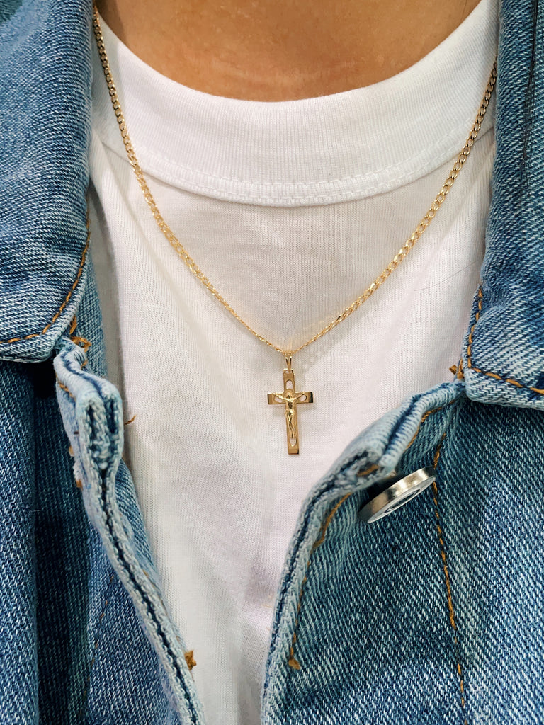 When the cross is made of the same chain pattern, this Link Crucifix pendant will definitely compliment any chain. Mixing finishes of polish and matte, this unisex cross is modern but with an traditional feel. Kim is wearing the Link Crucifix on our 19.25k Open Curb chain at 2mm width and 18" in length.