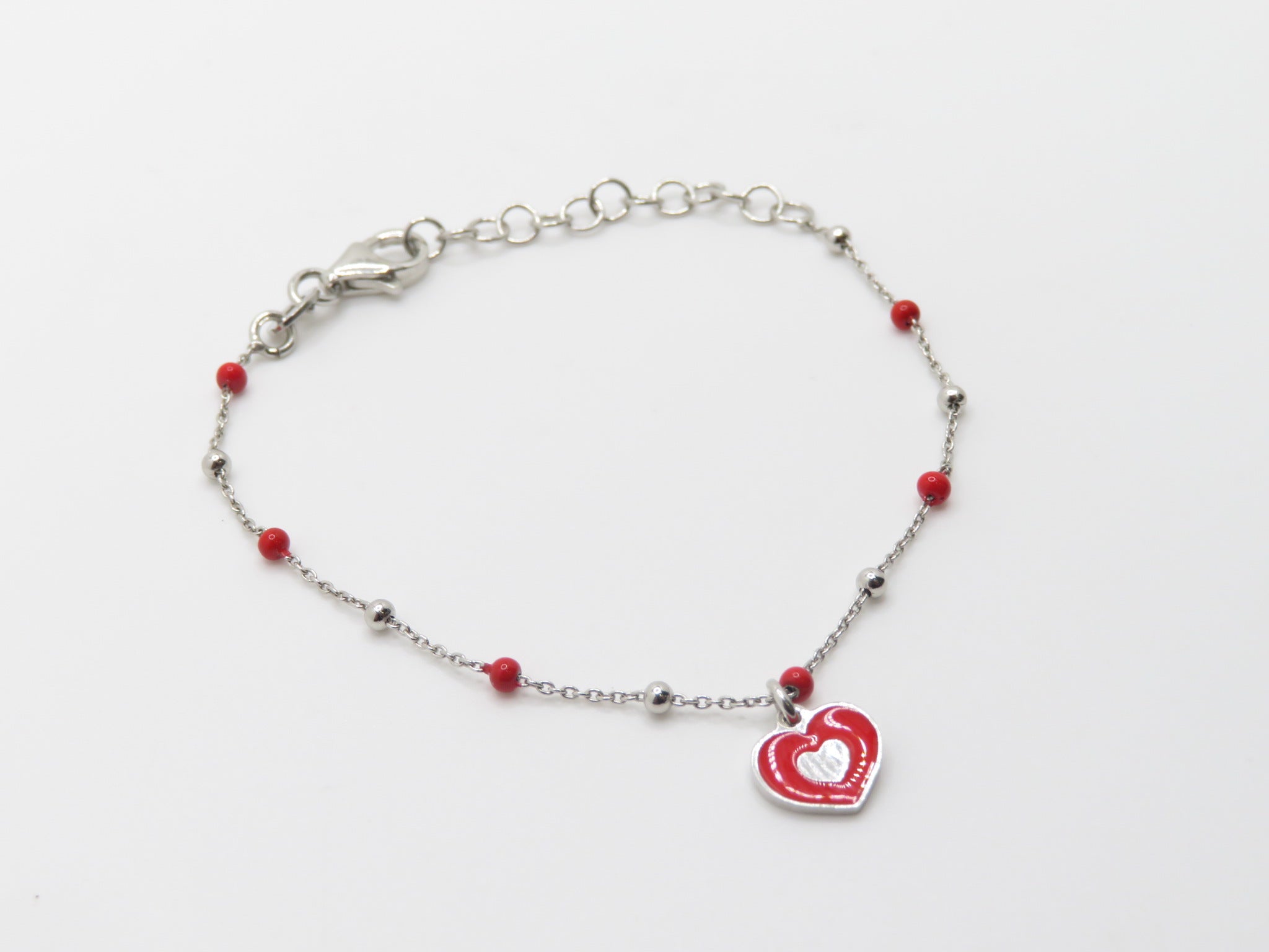 Sterling Red Beaded Enamel Heart Bracelet 6.25"