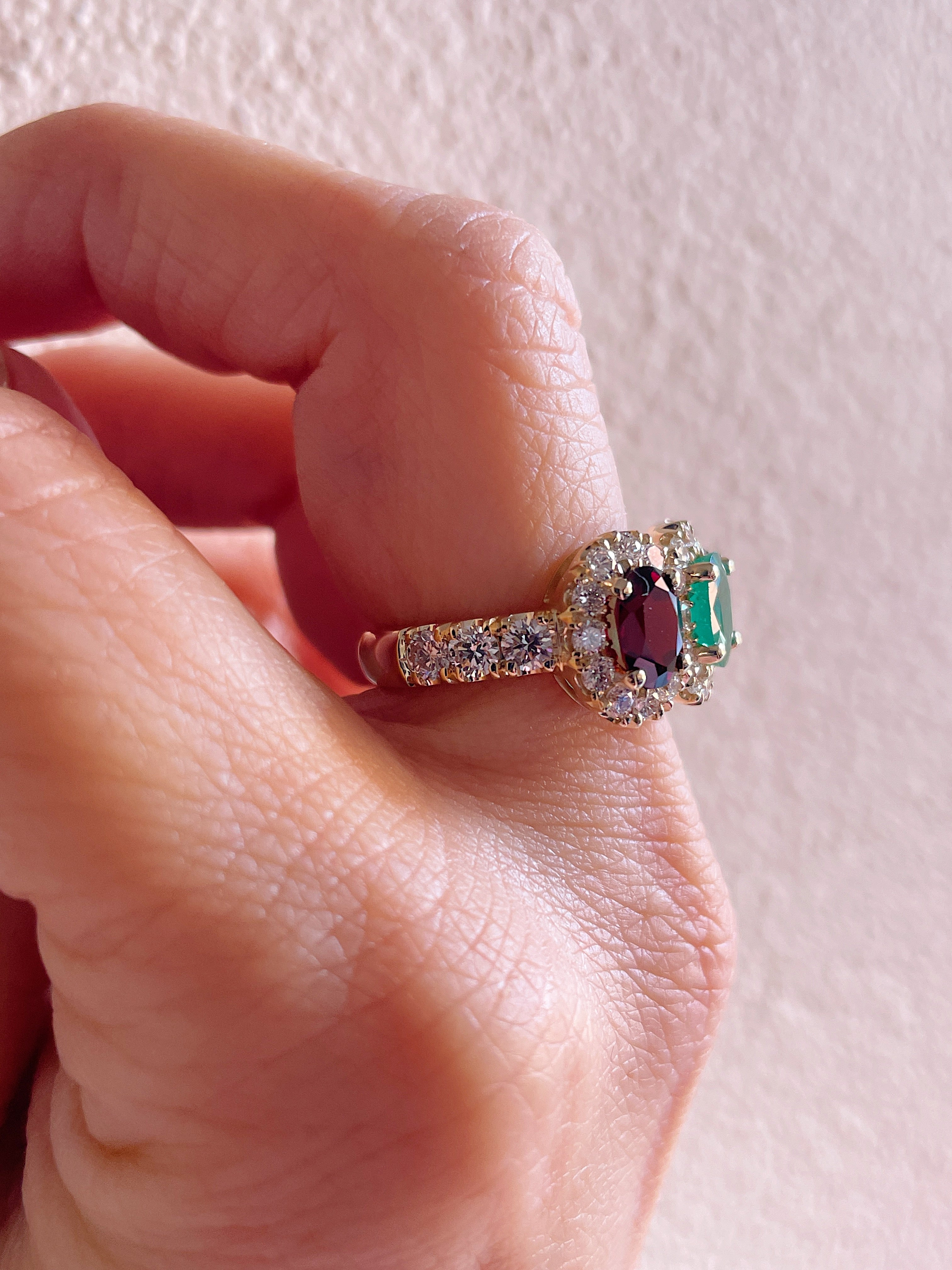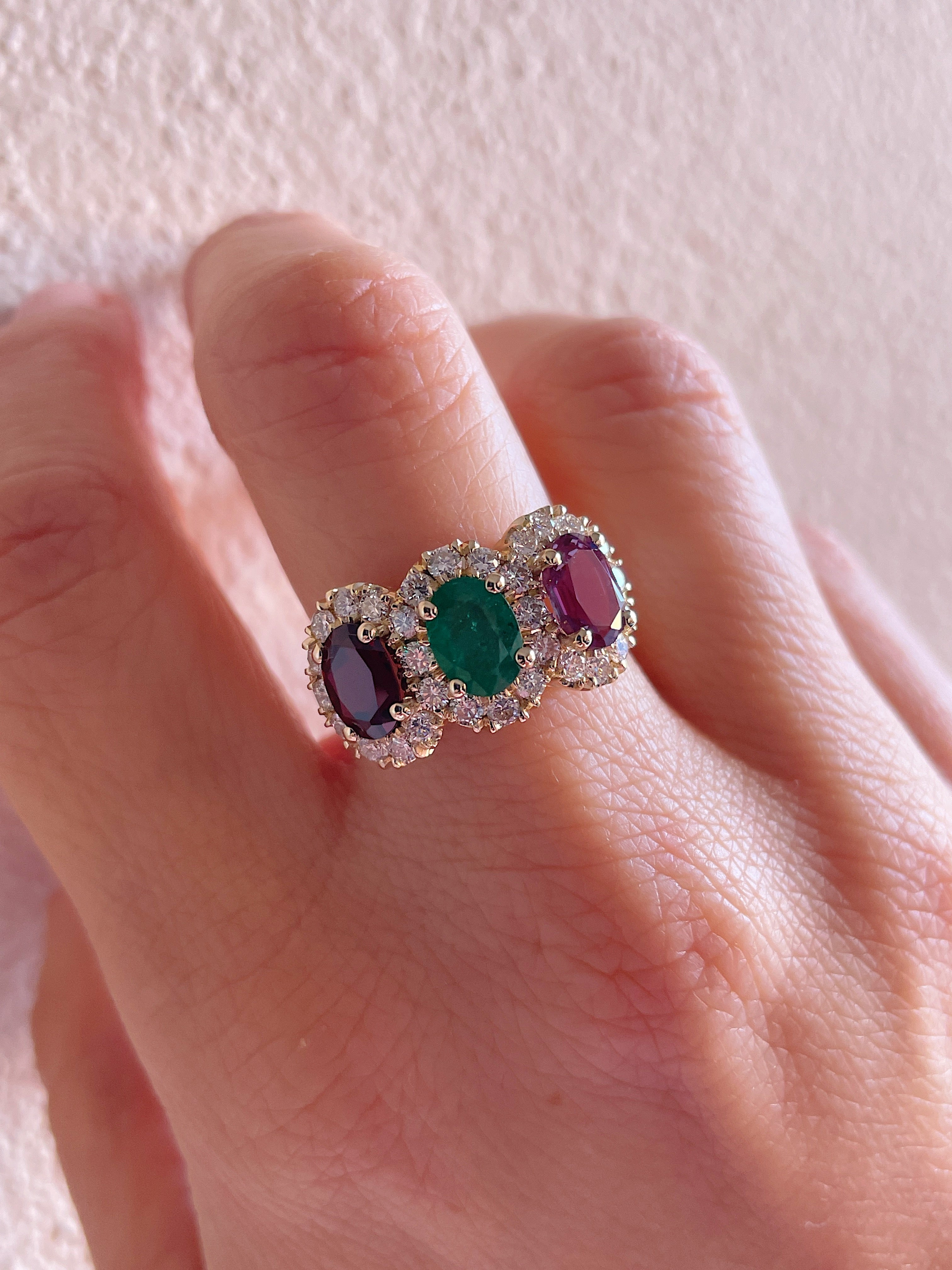 Designed by her 9 year old son to create his version of their family ring, this special piece will forever be cherished by this mother for it's sentimental meaning. The three primary stones consist of an heirloom Amethyst for February, flanked by light to medium toned Blue Sapphires for September, surrounded by Diamonds for April and Peridots for August. This same design can easily be remade using any combination of family gemstones, as shown with a Pink Tourmaline, Garnet and Amethyst or with the March and December combination. A statement ring that will be loved for years to come.