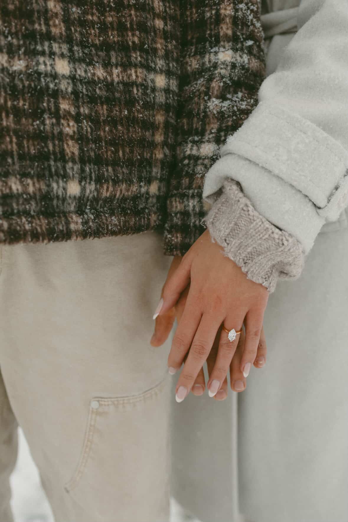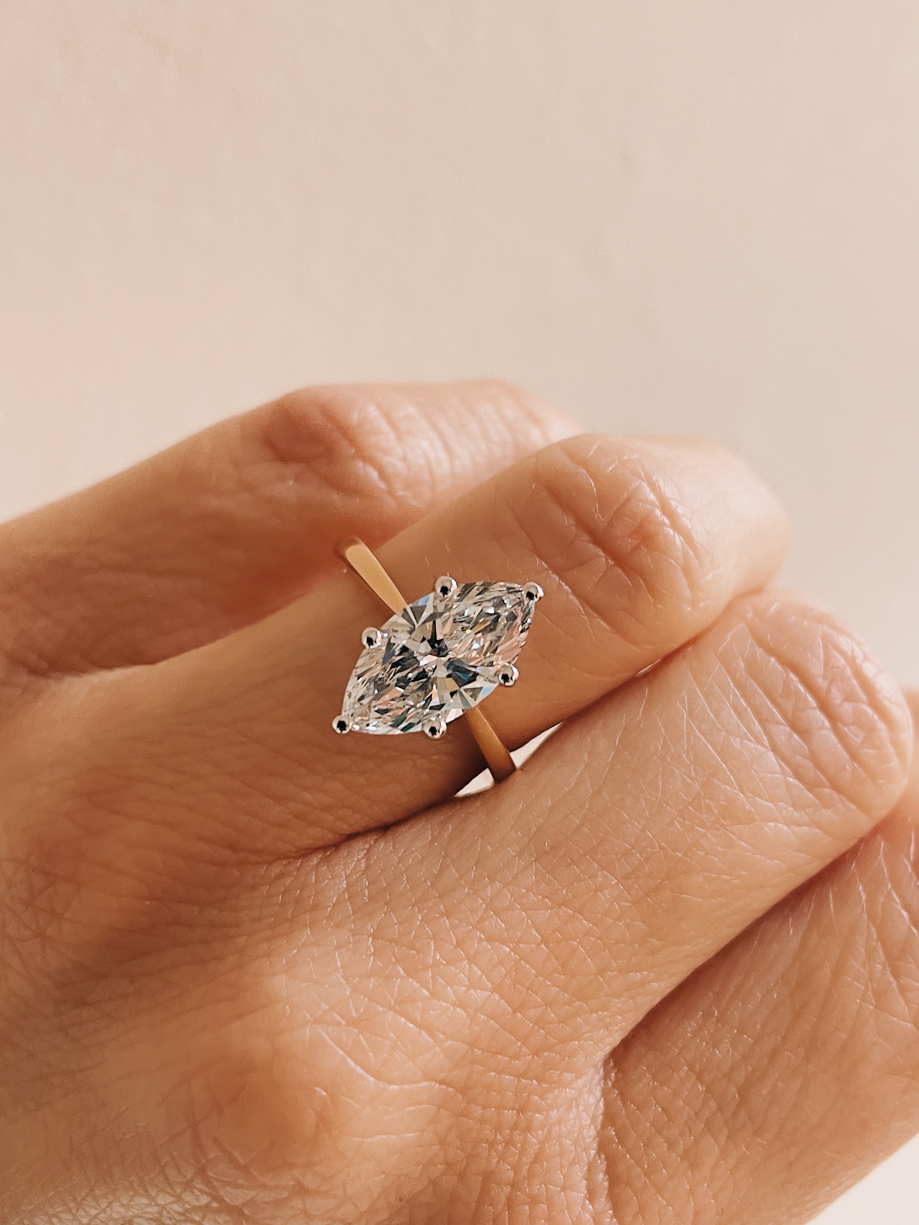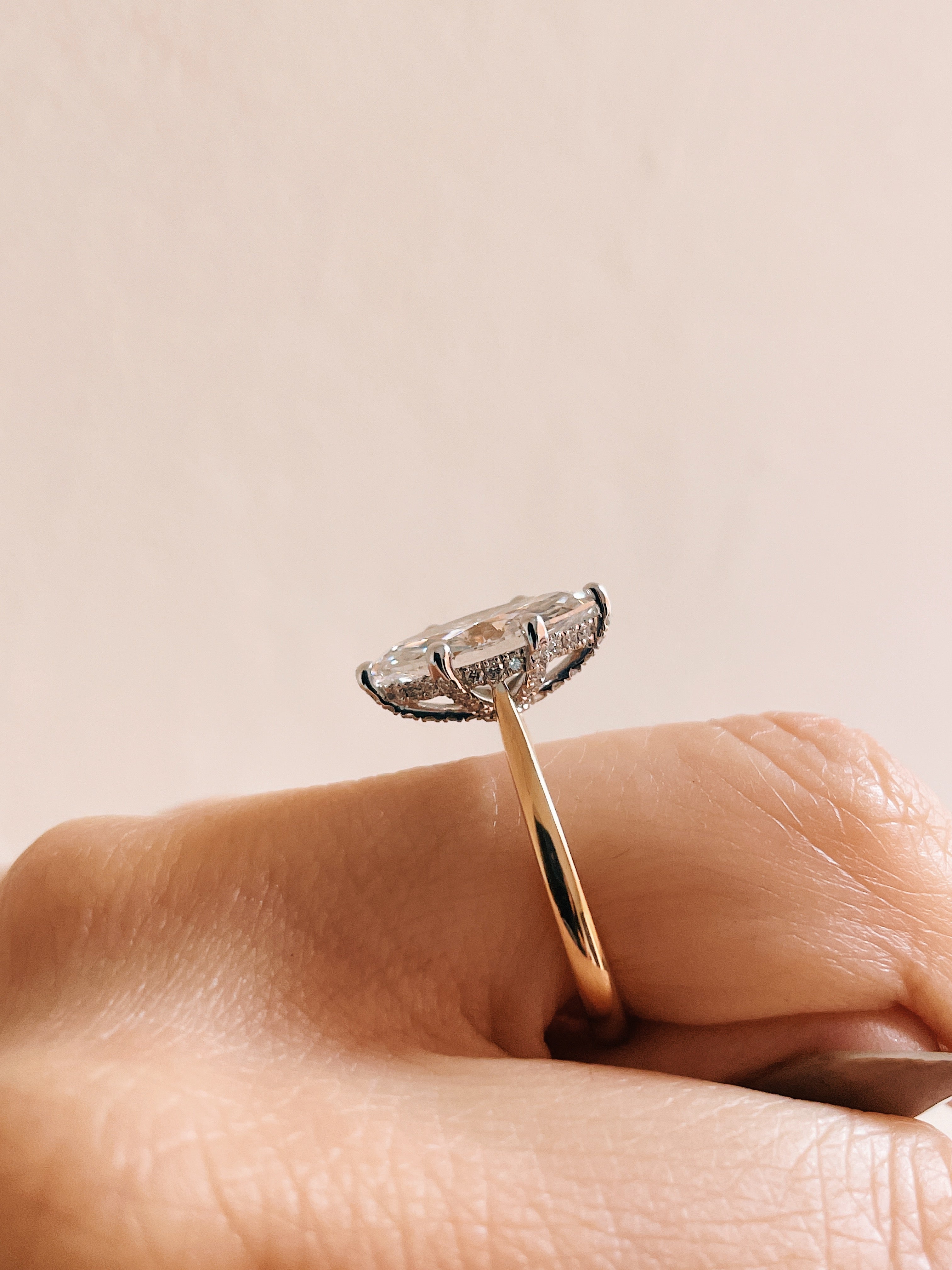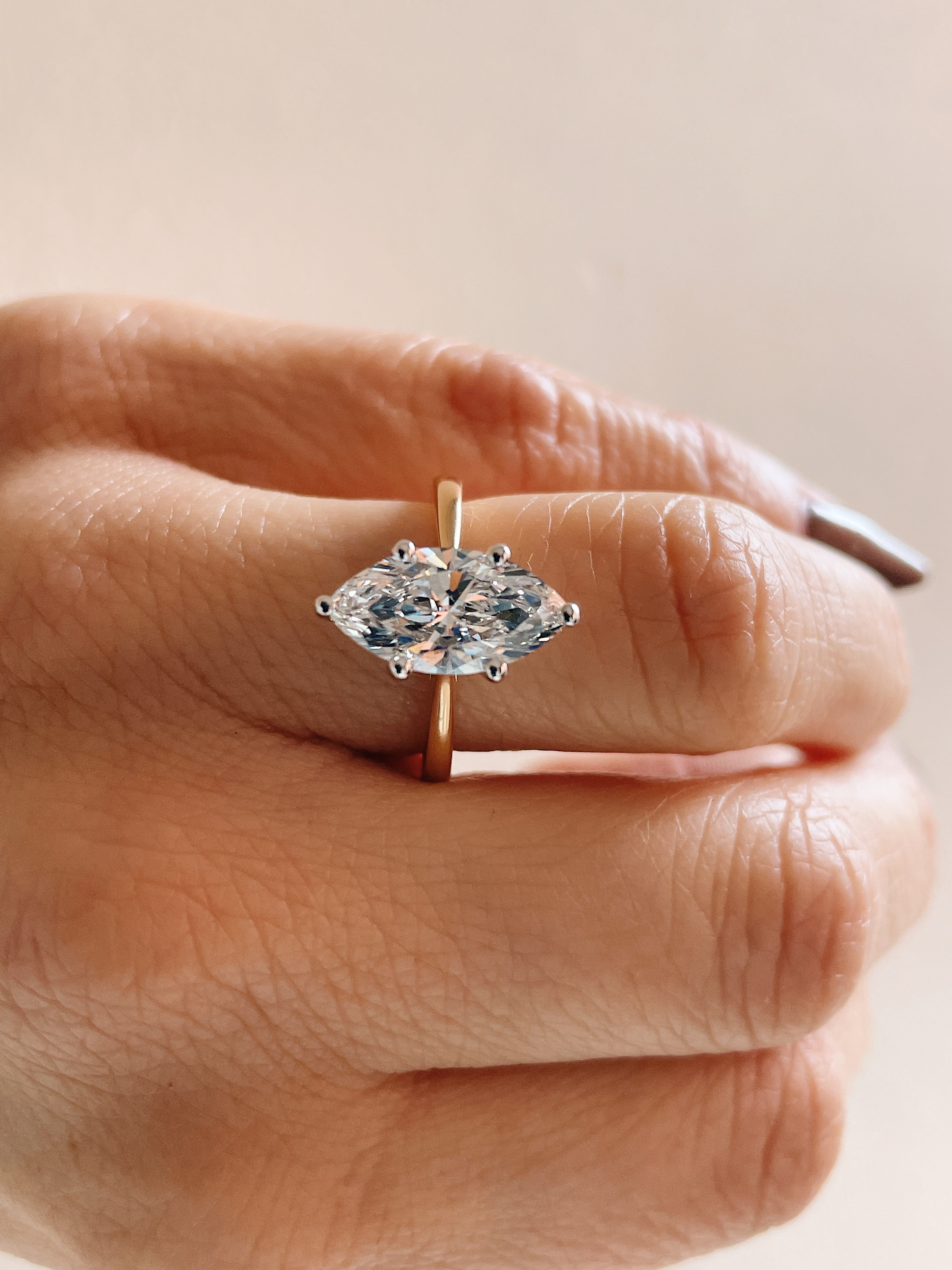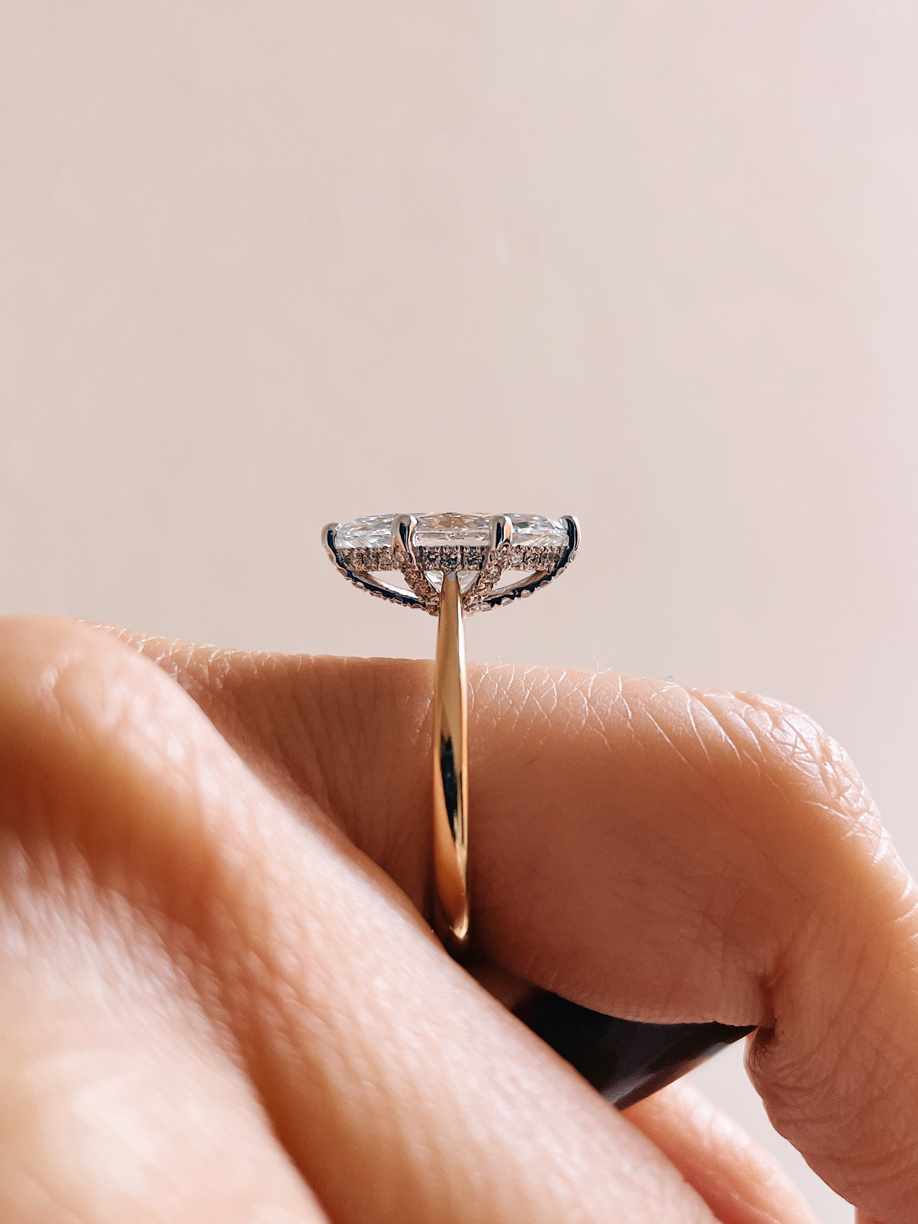 A striking solitaire featuring a 2.08ct Marquise cut diamond cradled in a prong setting accented with diamonds throughout. The two tone balance of this 19k rose gold gives this ring warmth and softness. The diamond galleries underneath frame the elongated silhouette, adding beautiful detail to this unique engagement ring.