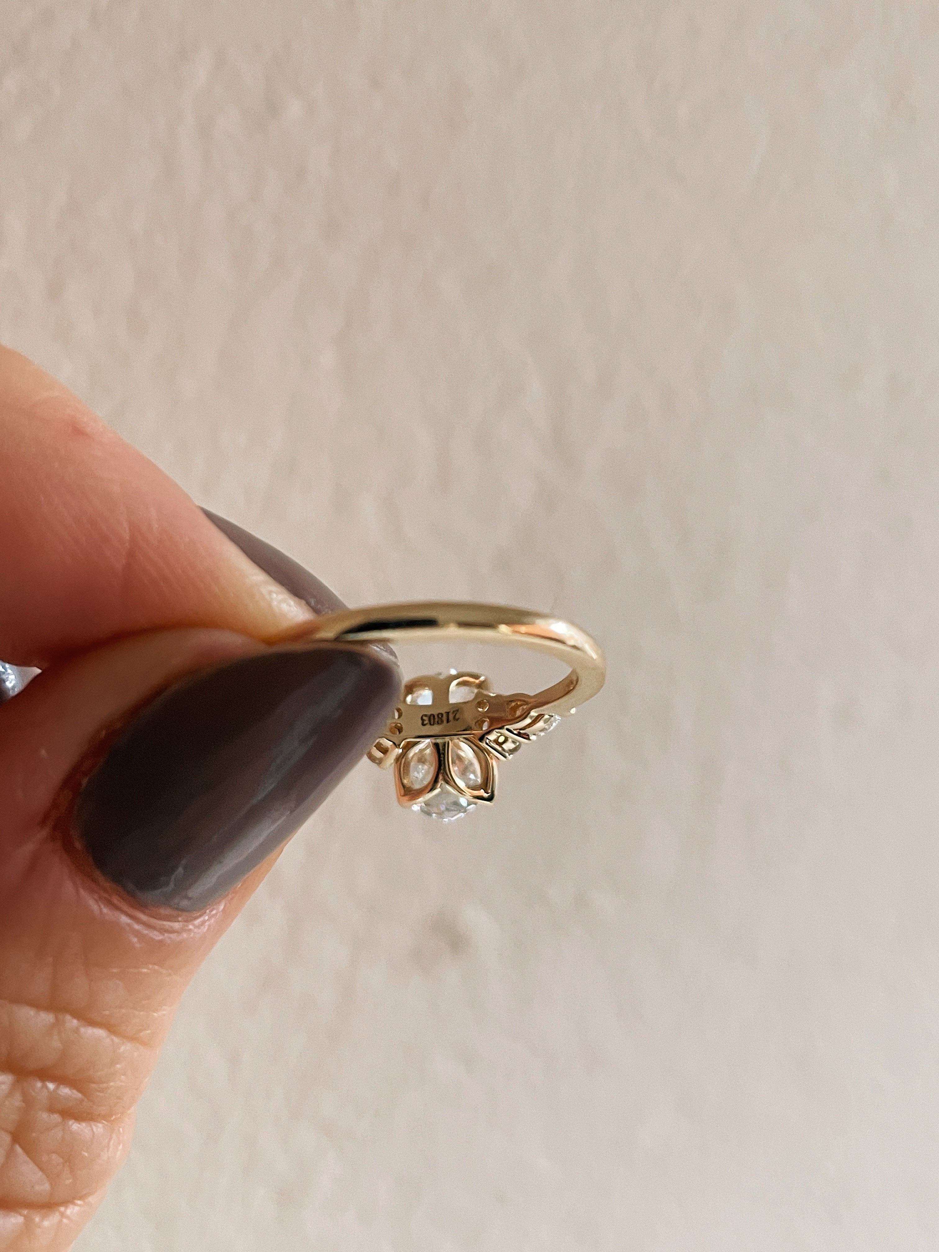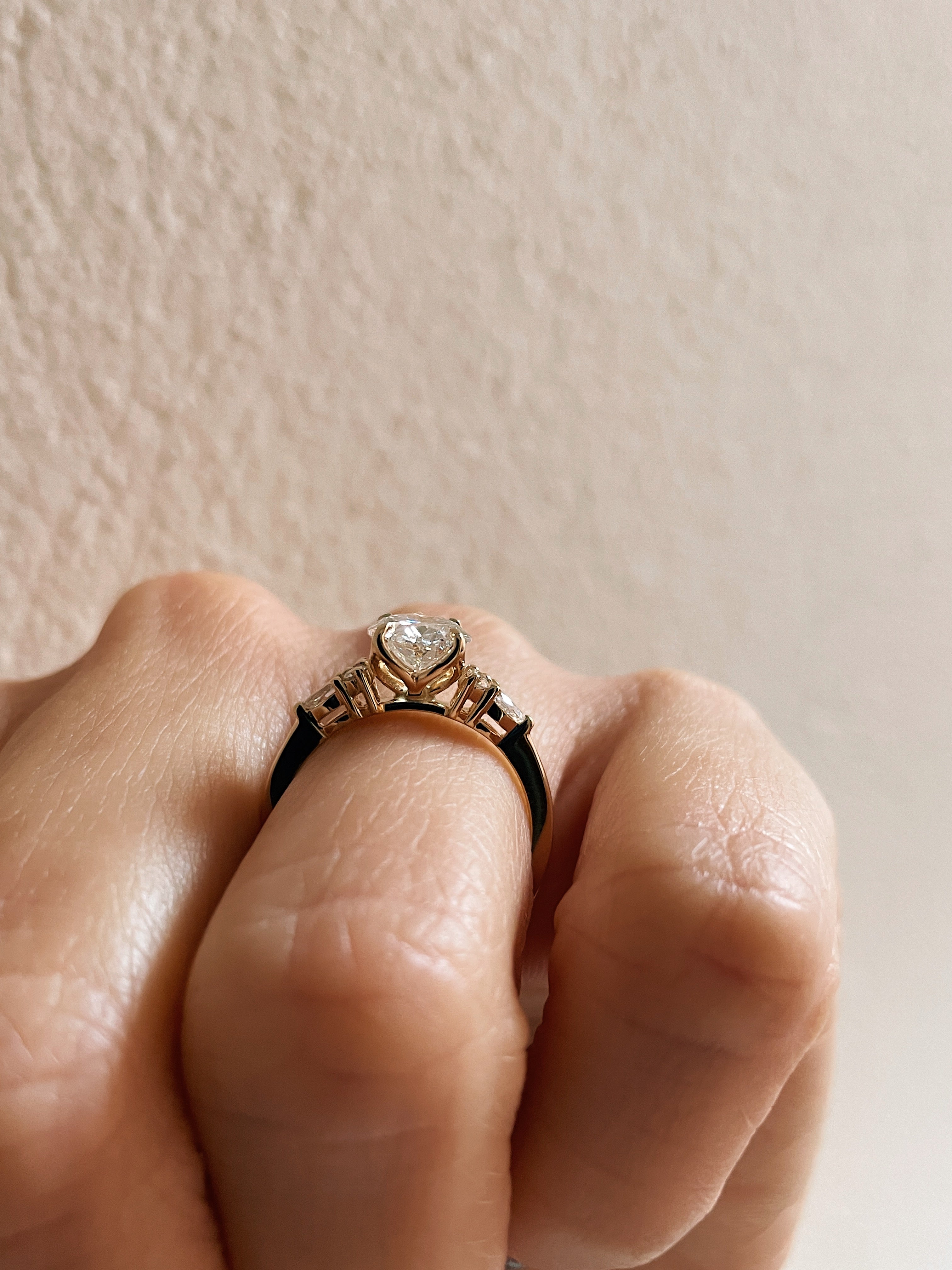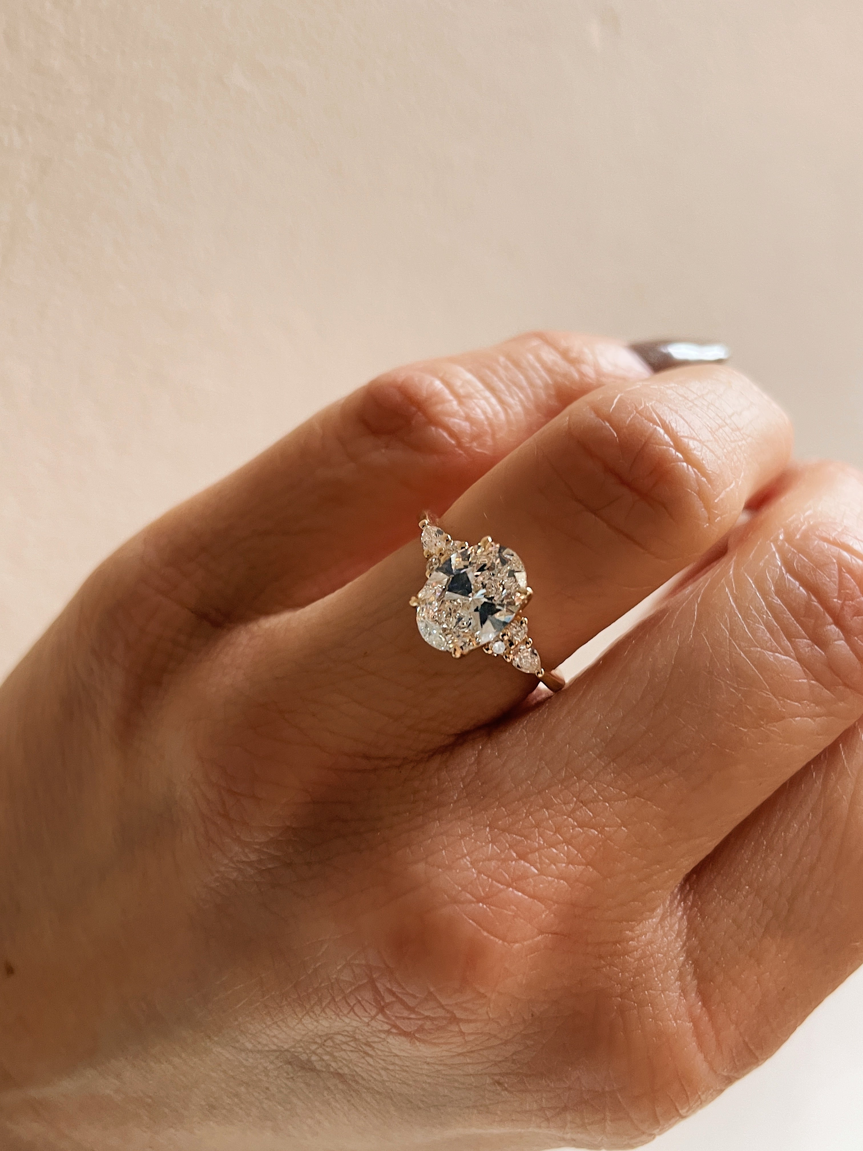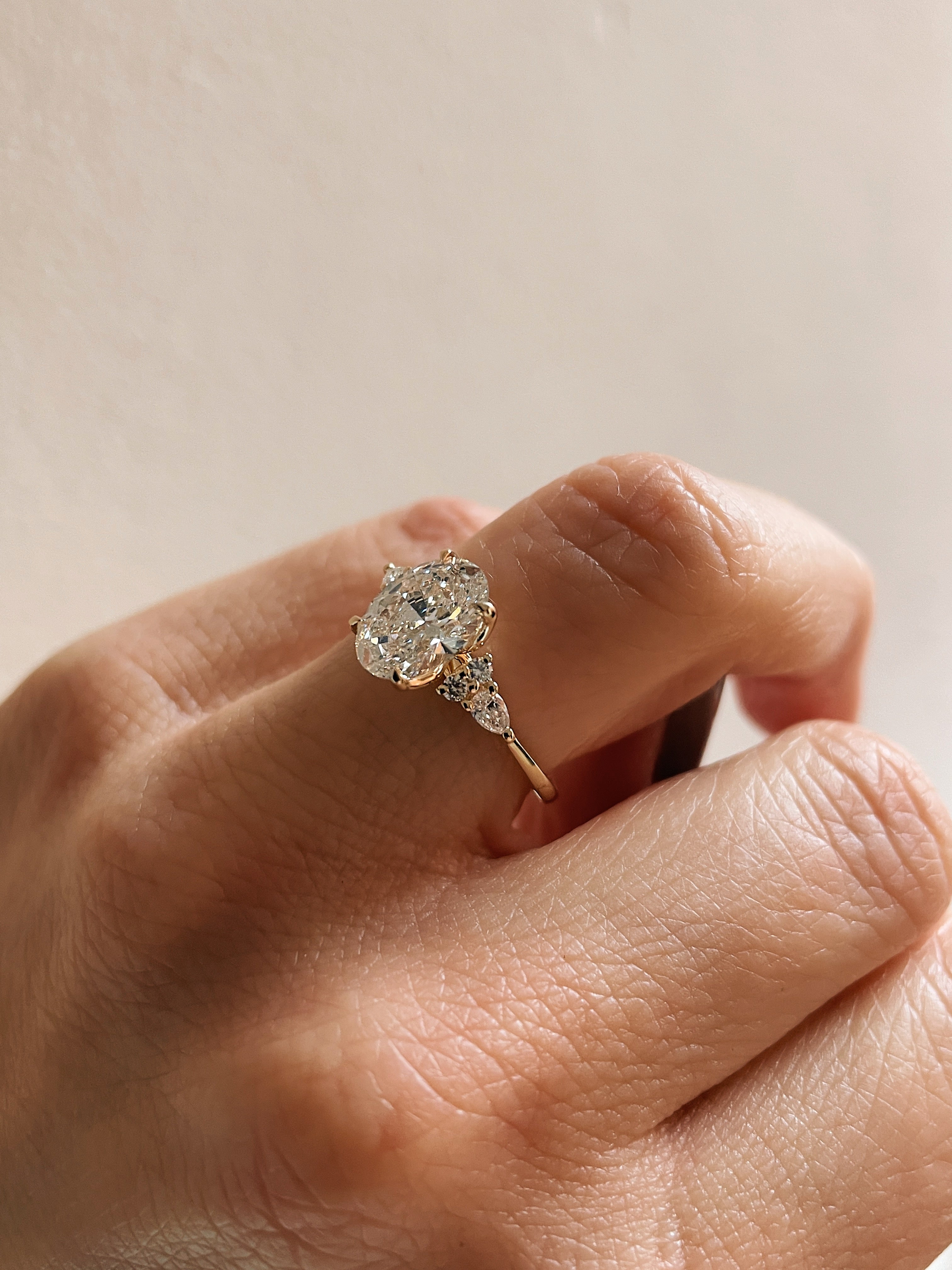 Take our beloved Jackie ring and swap the centre diamond for an oval, you get this stunning new Shannel engagement ring.  The elongated centre diamond is a beautiful 1.41 carat oval accented with petite pear and round diamond shoulders.  A four petal design under the prongs gives this ring lovely detailing throughout.  Making this ring all in 14k yellow gold gives it a soft, slightly warm tone perfect for any skin tone.