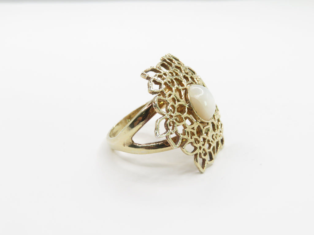A floral Moonstone ring worth talking about. This gold vermeil statement ring set with a cabochon moonstone will grab everyone's attention at your next girl's night out.