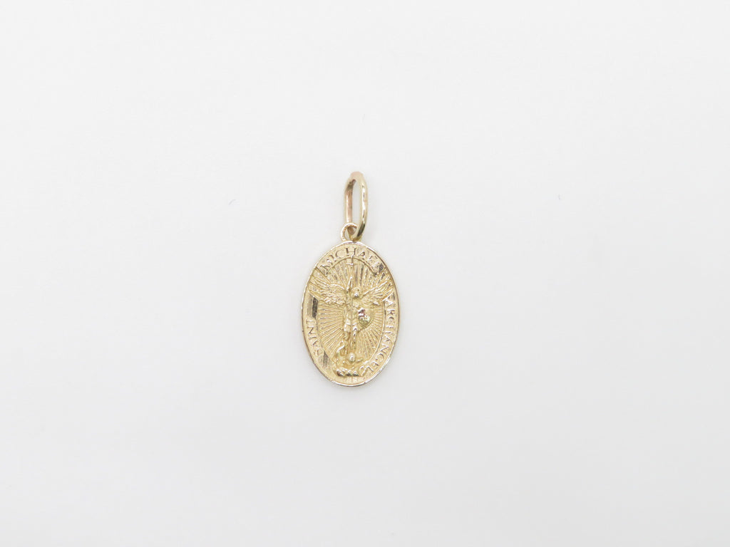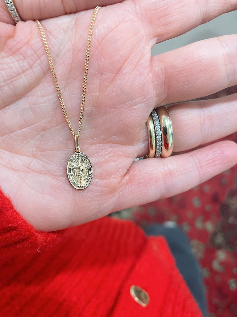 A symbolic religious medallion, Saint Michael is the patron saint of battle and adversity. This archangel is your protector from evil and a champion of good over evil. A true symbol of justice. The beautiful new solid medallion is accented with the written phrase "Saint Michael Archangel". Pictured with our 10k Curb Chain in 1.1mm and measuring 16" in length.
