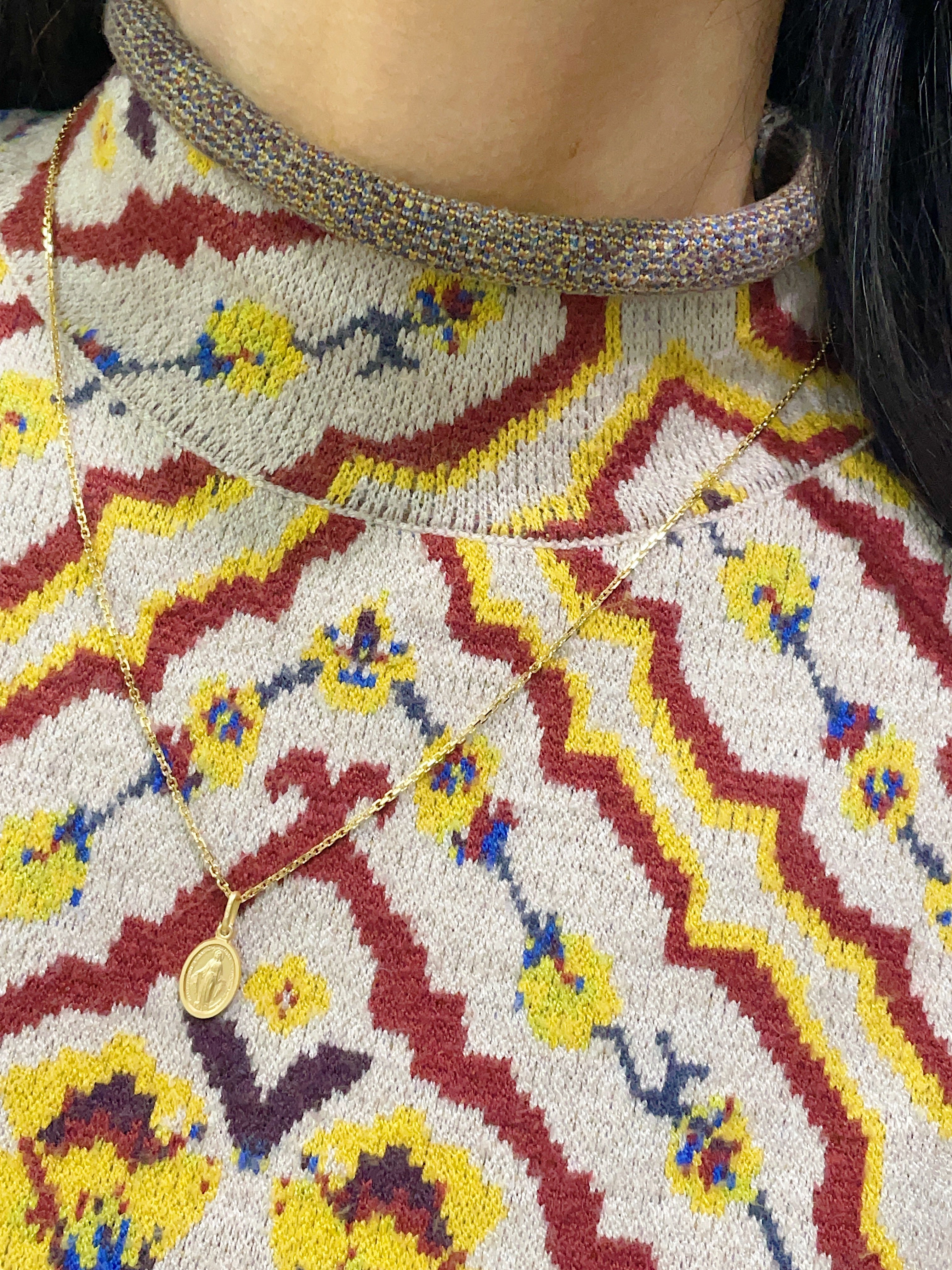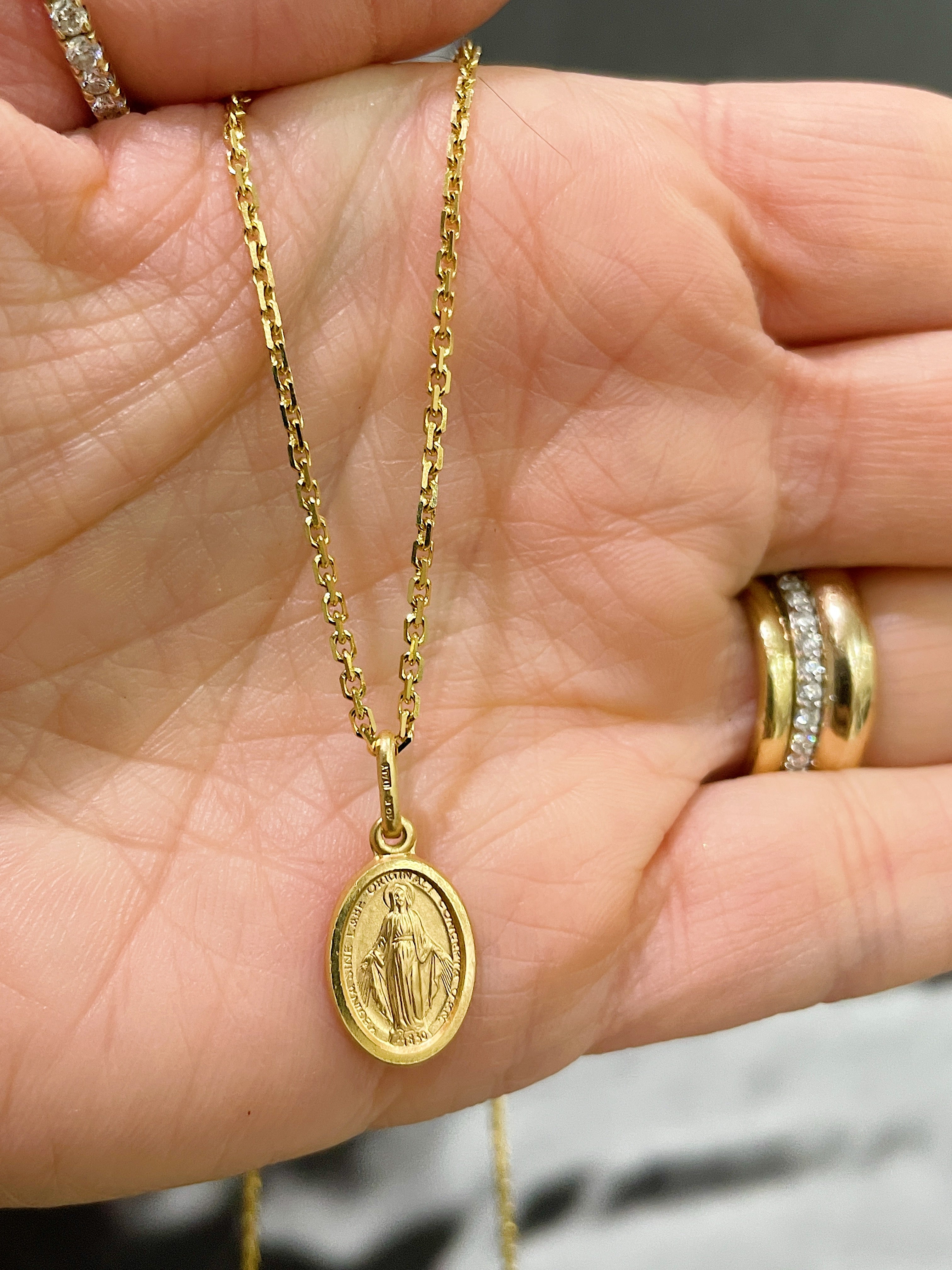 This medallion of Our Lady of Grace is double sided with a matte and polished finishing. A Miraculous medal with the hopes that one will receive her grace when in need. Channeling God's blessings, mercy and compassion, this Lady of Grace appears with rays of light from her hands and standing on a globe and serpent showing her triumph over evil. Pictured with our 10k Oval Cable chain at 20" in length.