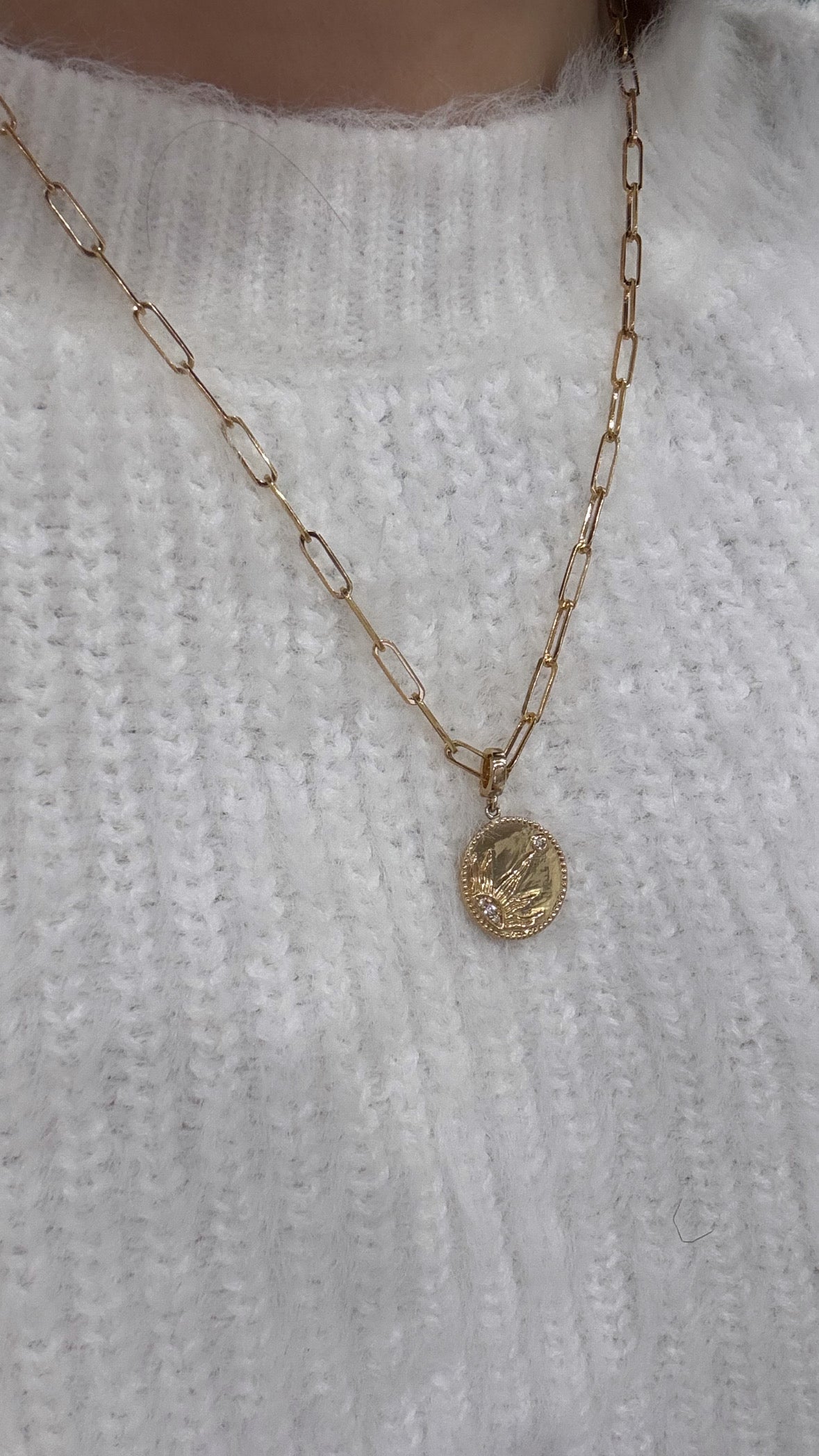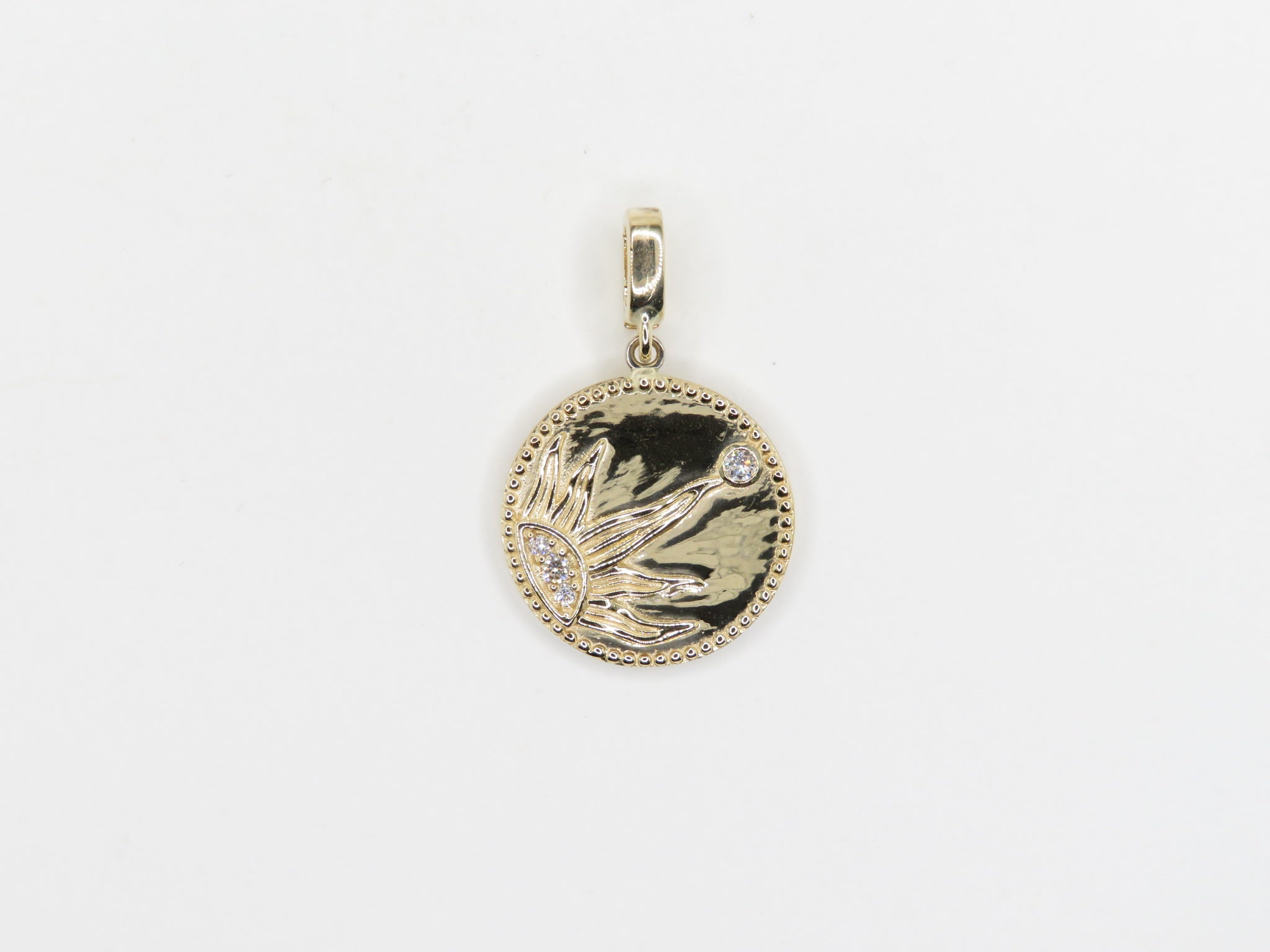 A round gold Celestial pendant featuring a sculpted sunburst and cubic zirconia accents. With its beaded edge and subtle shimmer, this pendant brings a touch of light and elegance to any look. Attach the charm to the necklace or bracelet of your choice with the ease of a its secure latch fastening.