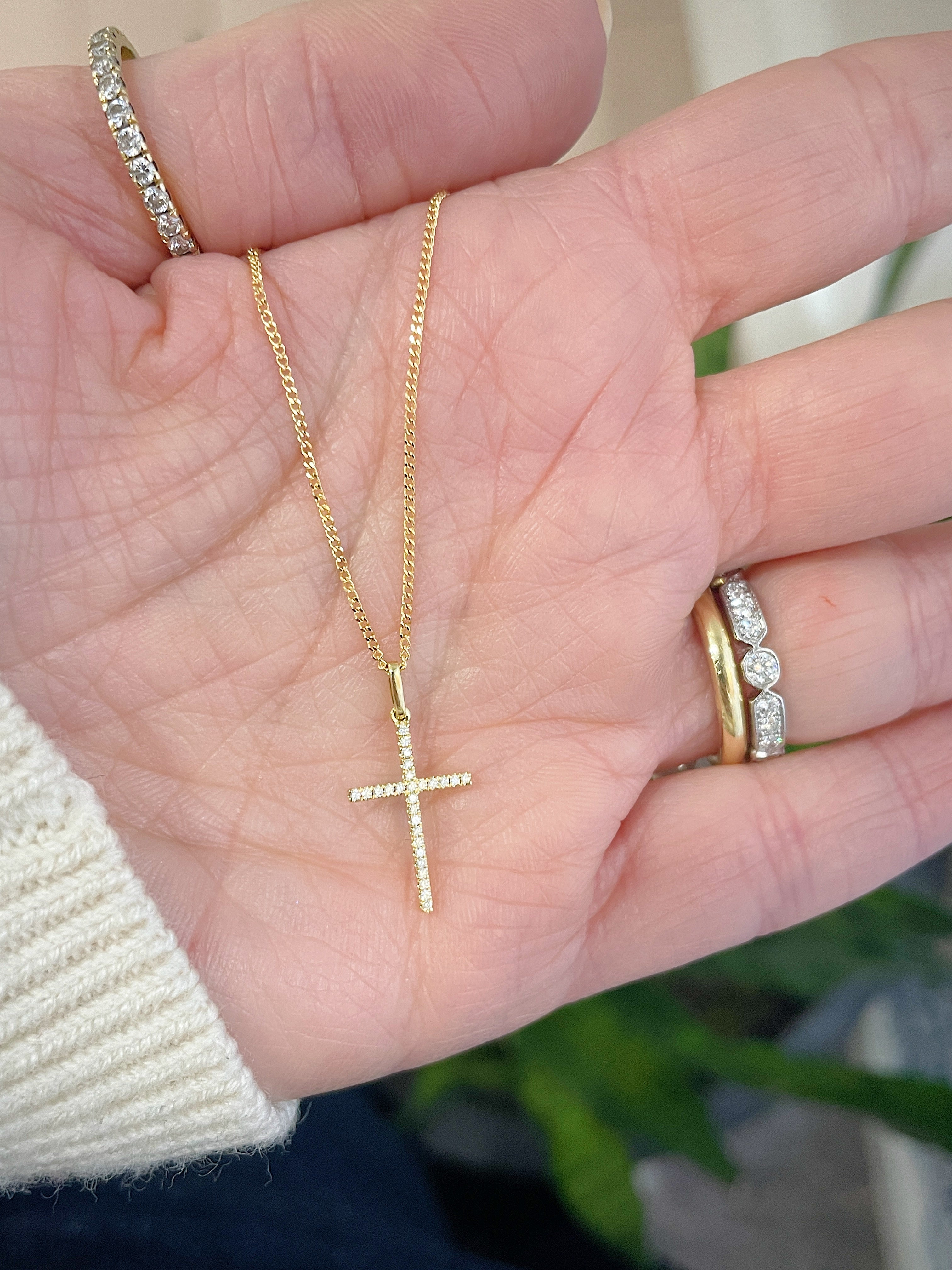 An even daintier option, this sweet Diamond Cross Necklace is slightlier thinner than our original Micro Pavé Diamond Cross. Strung on a classic Curb chain measuring 16" in length, and featuring a beautiful Italian made 18k yellow gold, this nicely proportioned cross pendant is a timeless piece. Set with 27 natural and full cut diamonds and finished with a high polished rounded bail, this pendant sits nicely and is perfect for everyday wear.