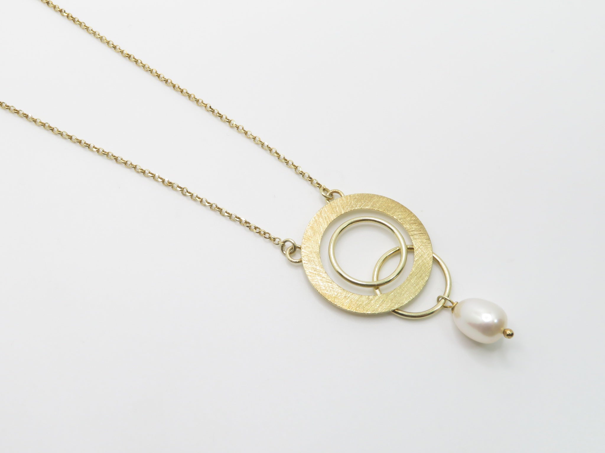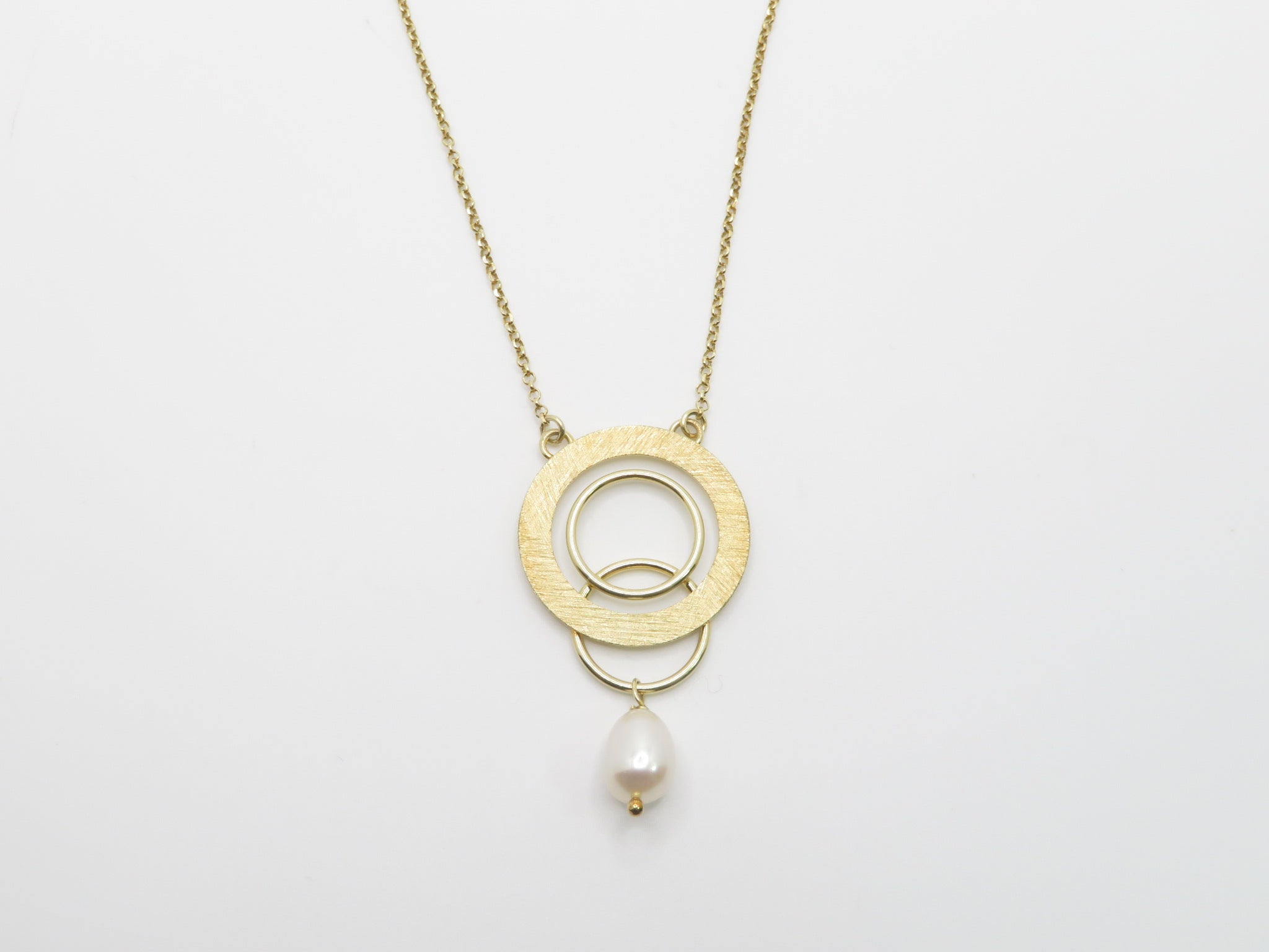 A modern gold vermeil necklace with interlocking circles set with a single 7.5mm oblong pearl drop - minimal, elegant, and timeless.