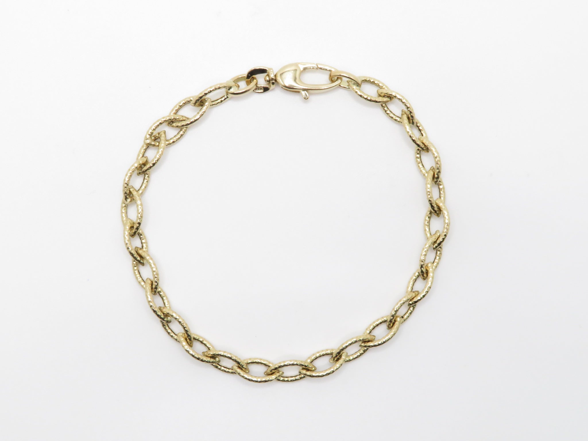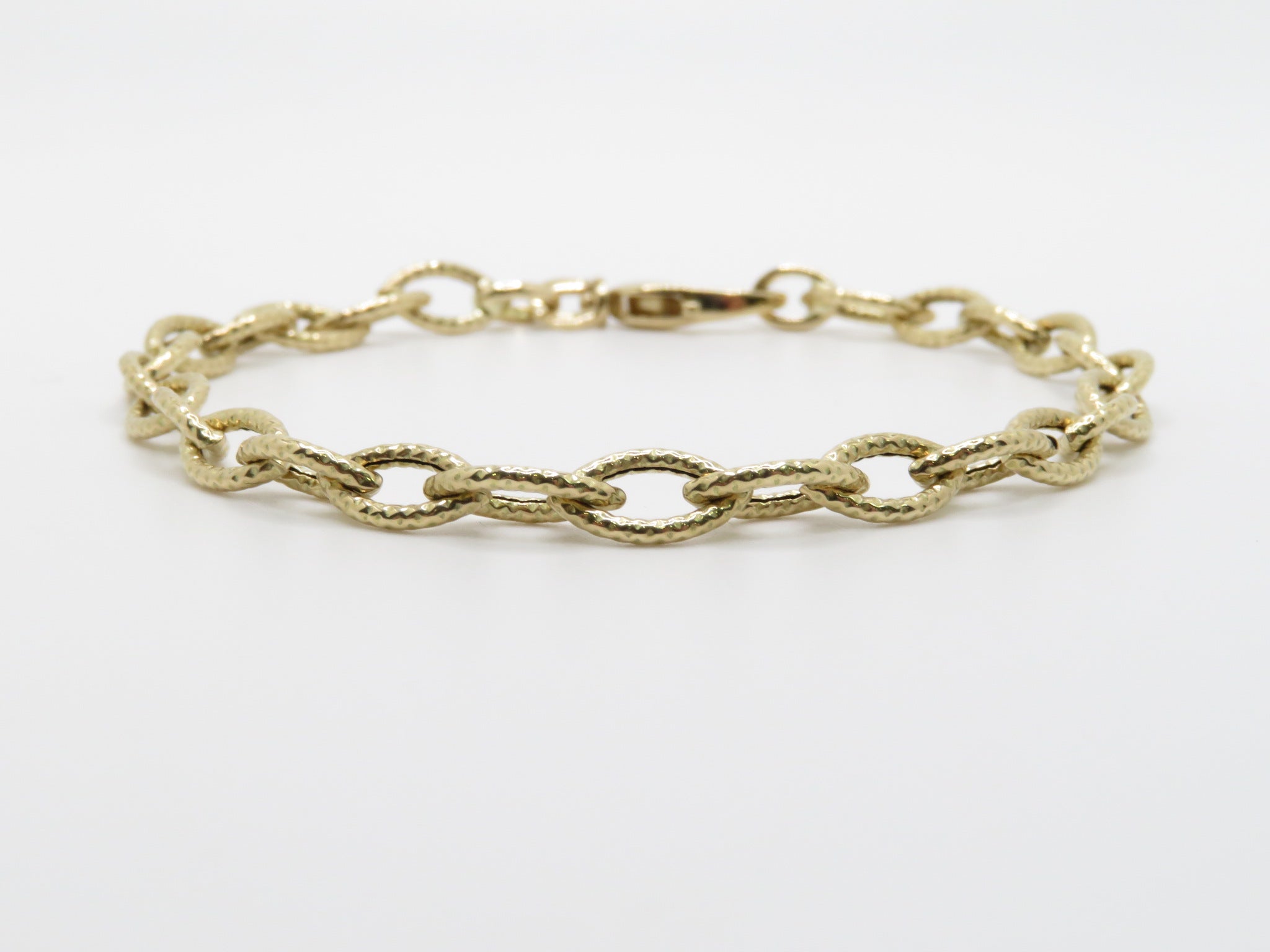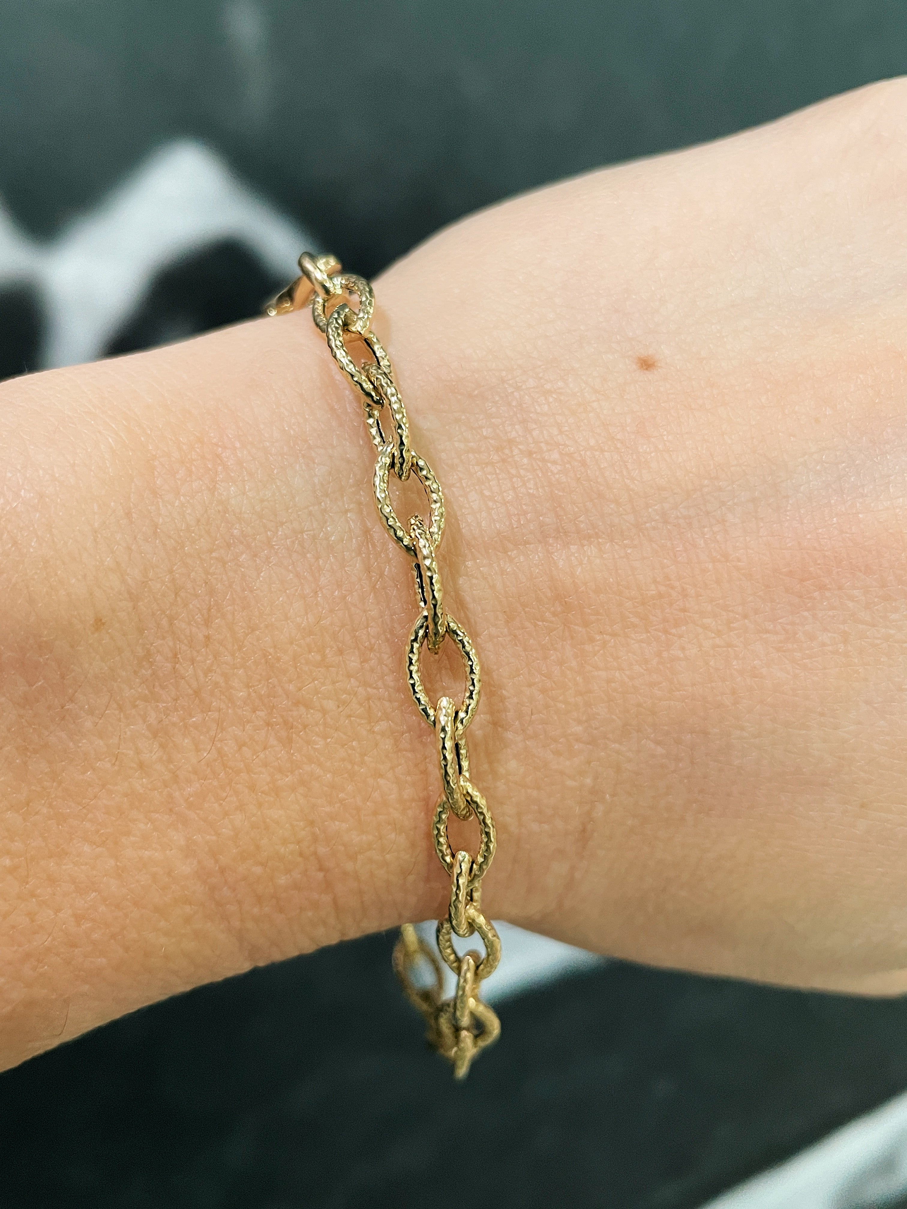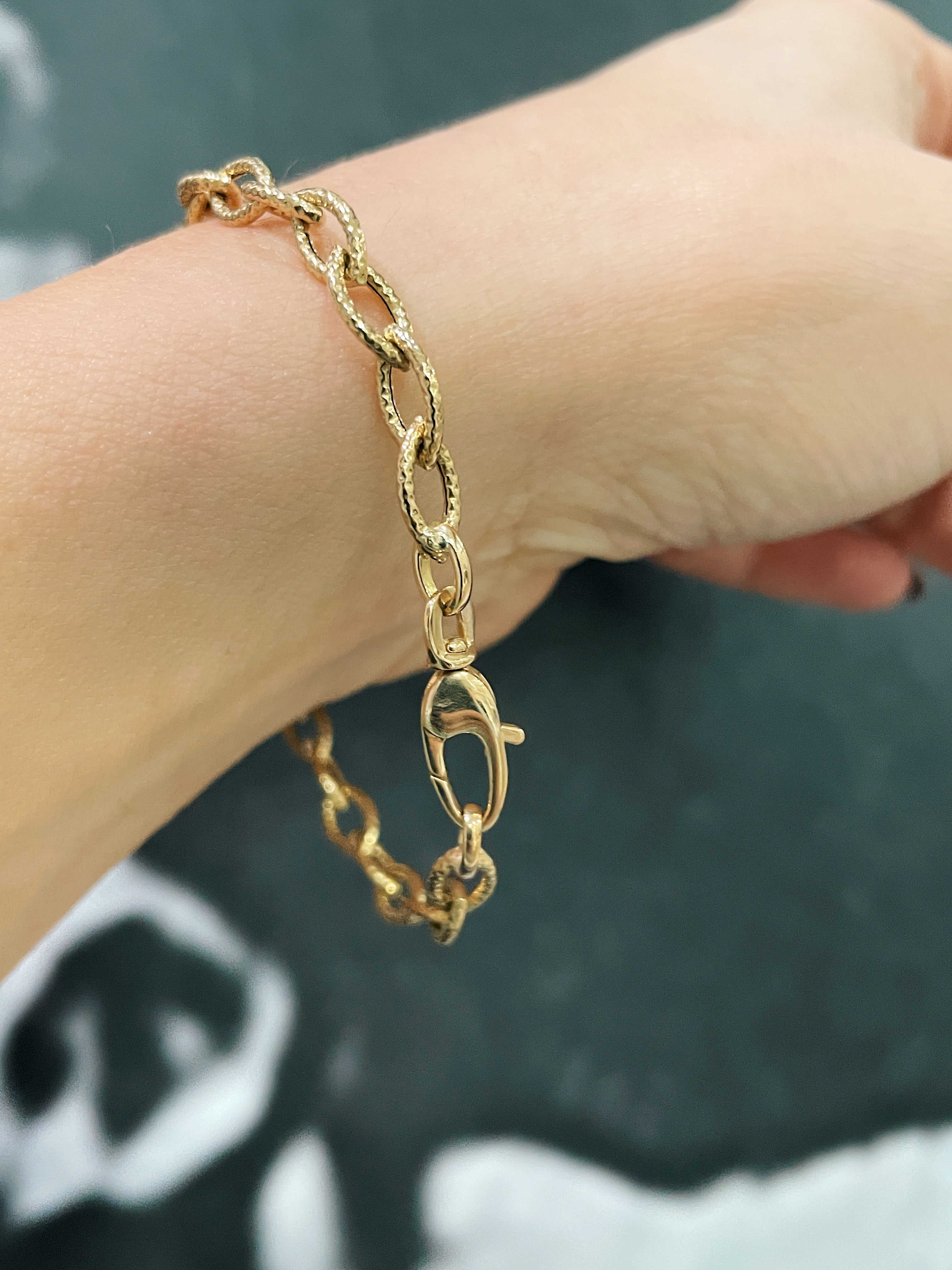 A new friend to add to your arm stack, this lovely Etched Marquise Link bracelet will quickly become your new favourite accessory. The marquise shaped links are subtly texturized for a great finish, making this bracelet more modern than the popular paperclip link pattern. Finished with a nice sized marquise shaped lobster closure, this bracelet can be adjusted to any length.