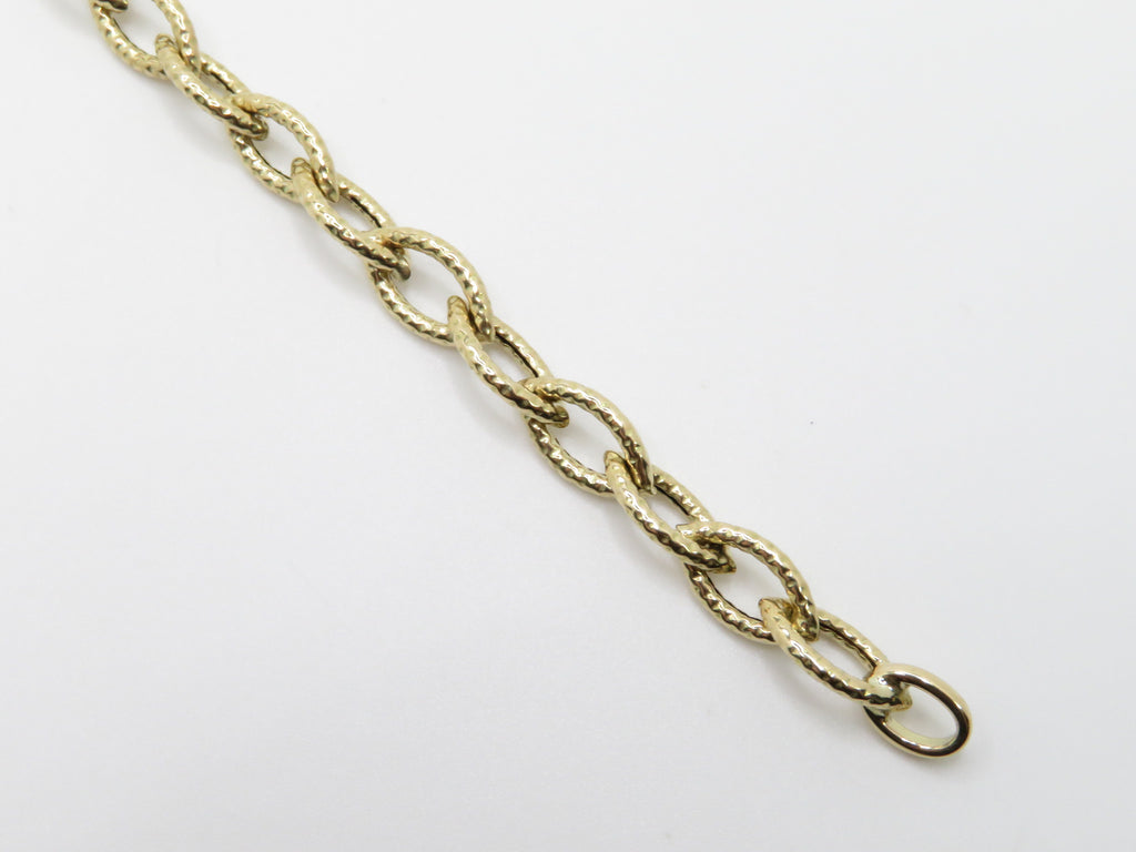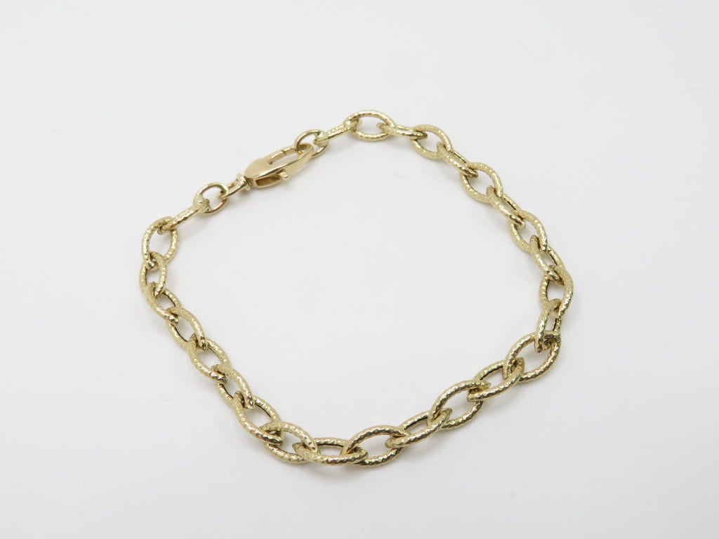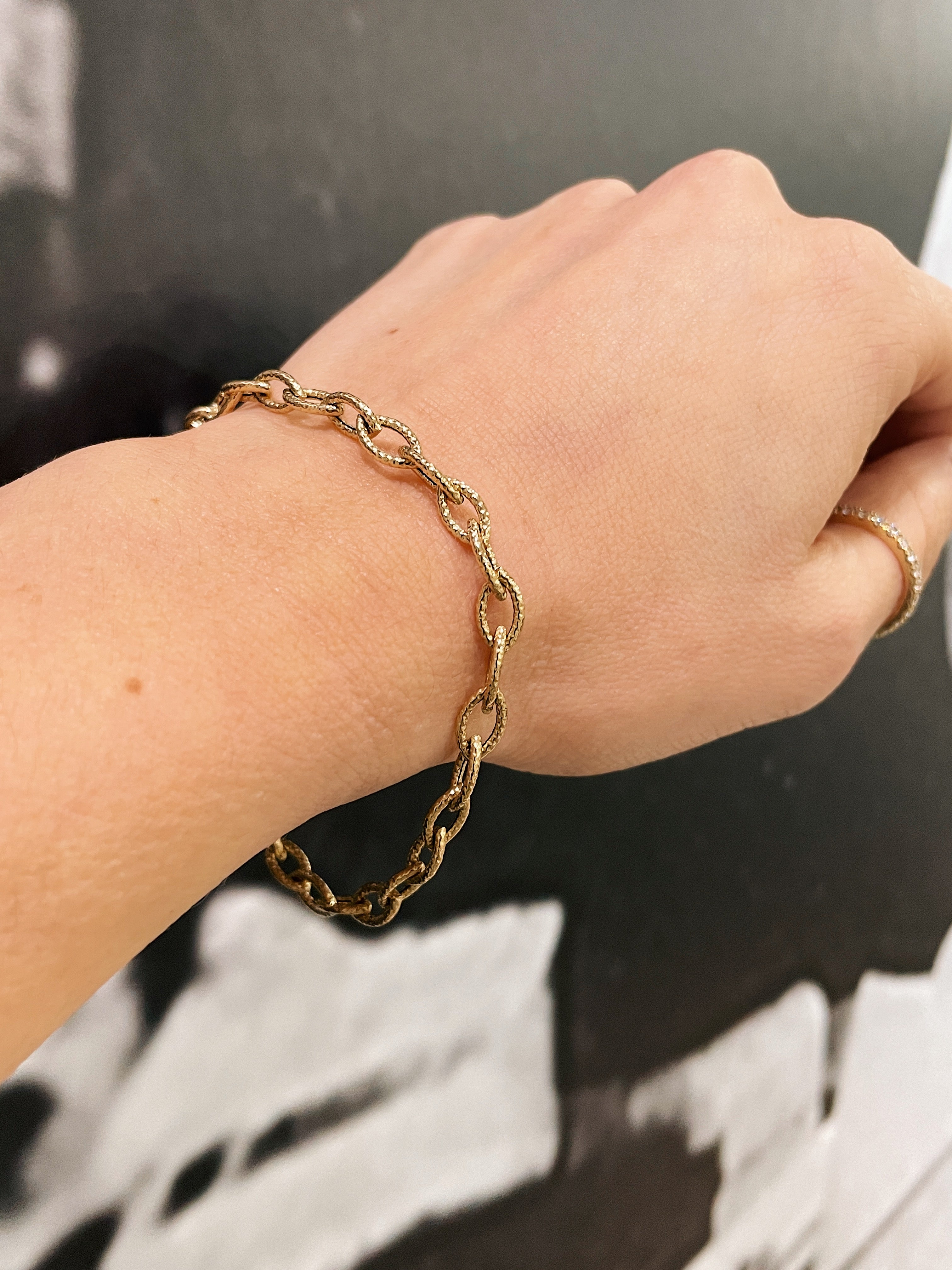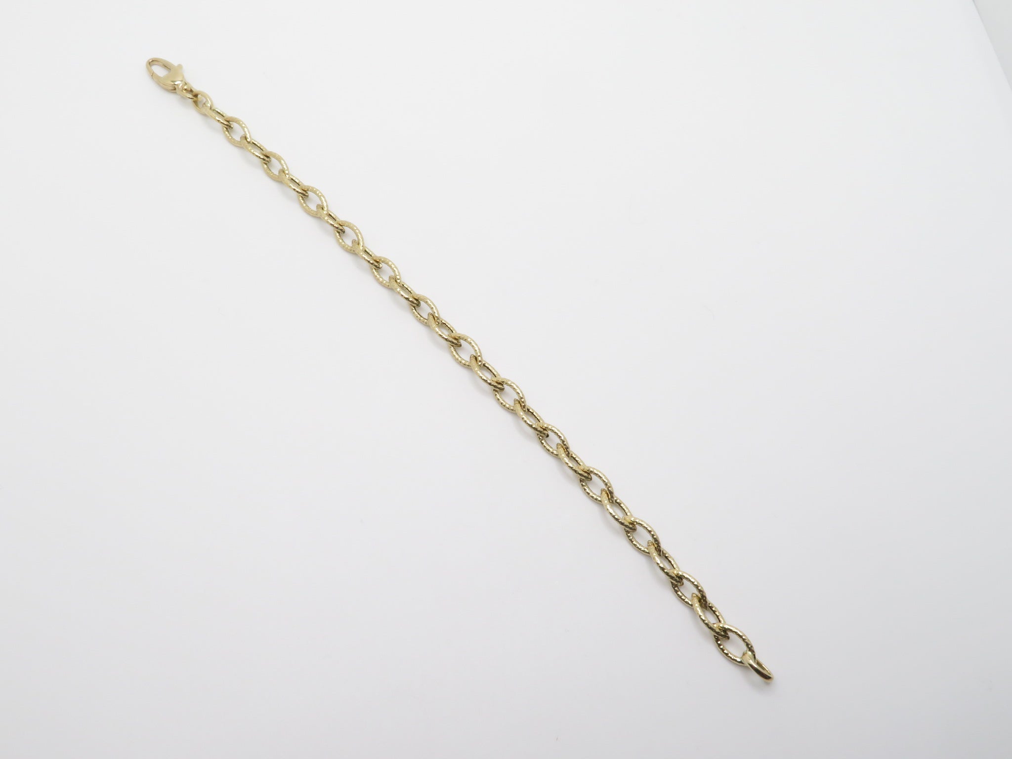 A new friend to add to your arm stack, this lovely Etched Marquise Link bracelet will quickly become your new favourite accessory. The marquise shaped links are subtly texturized for a great finish, making this bracelet more modern than the popular paperclip link pattern. Finished with a nice sized marquise shaped lobster closure, this bracelet can be adjusted to any length.