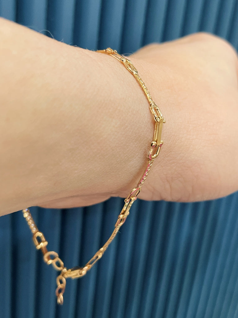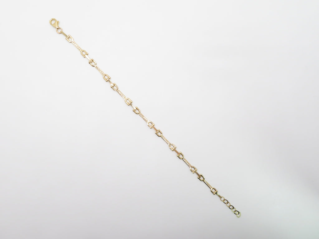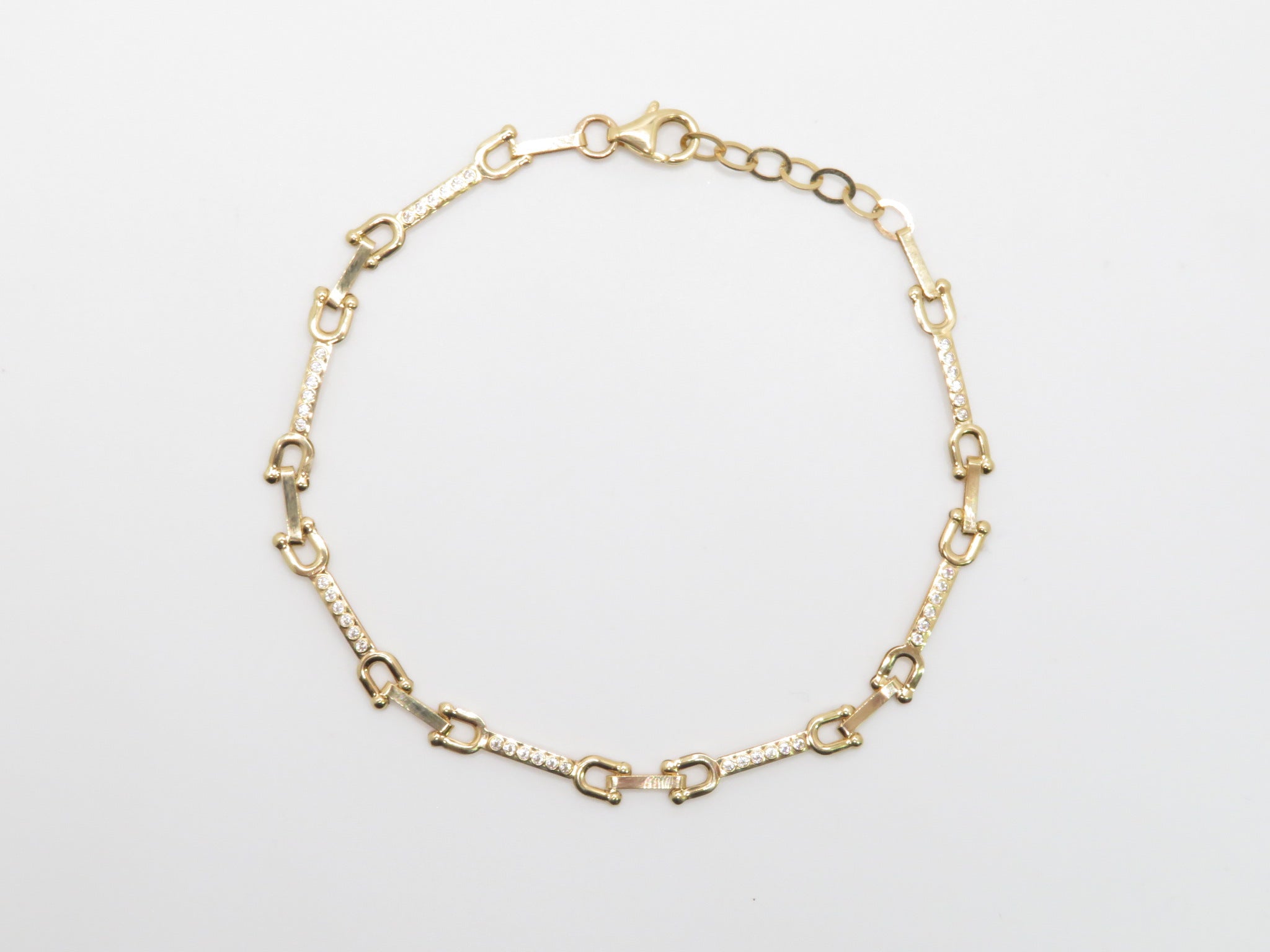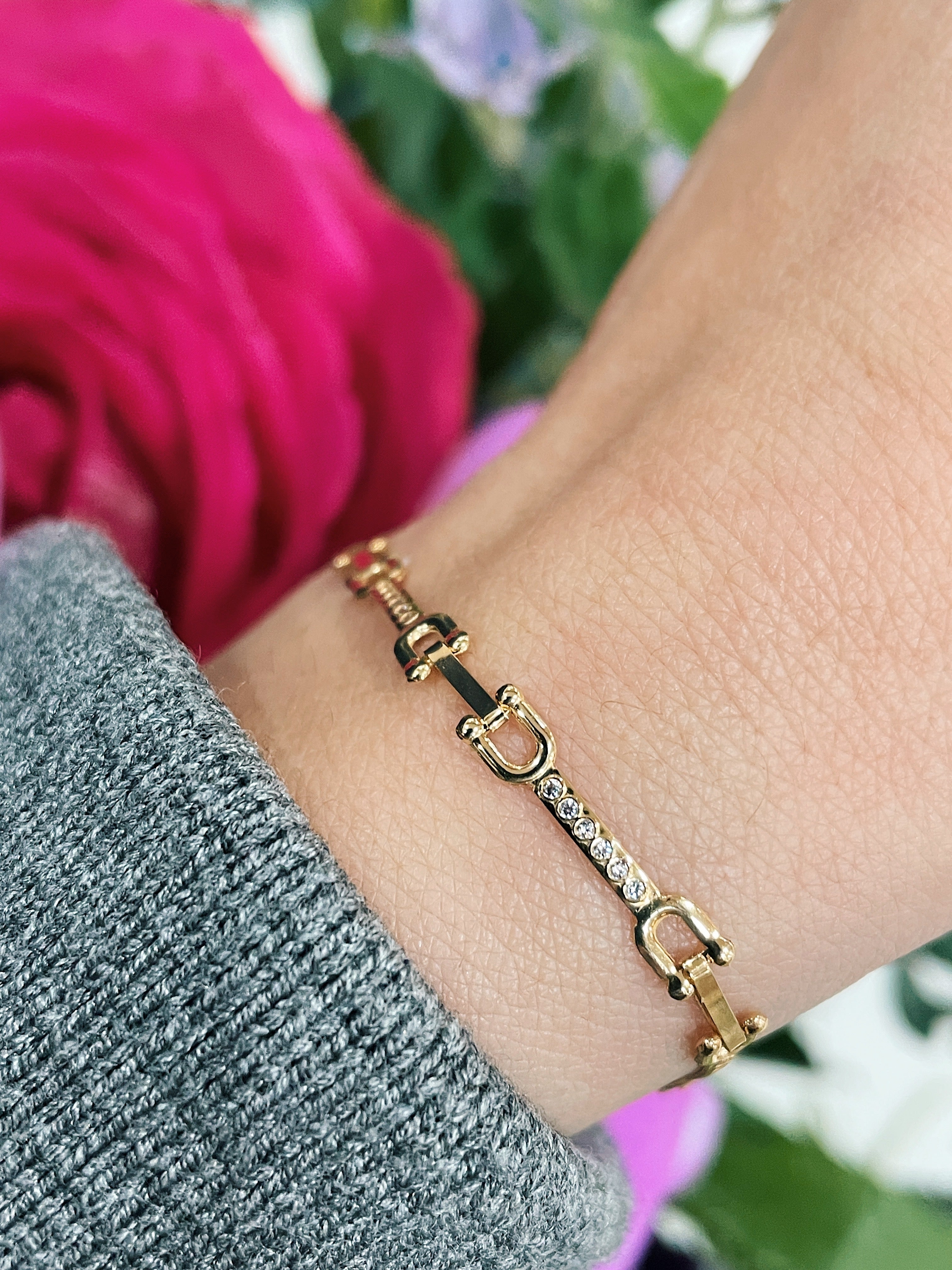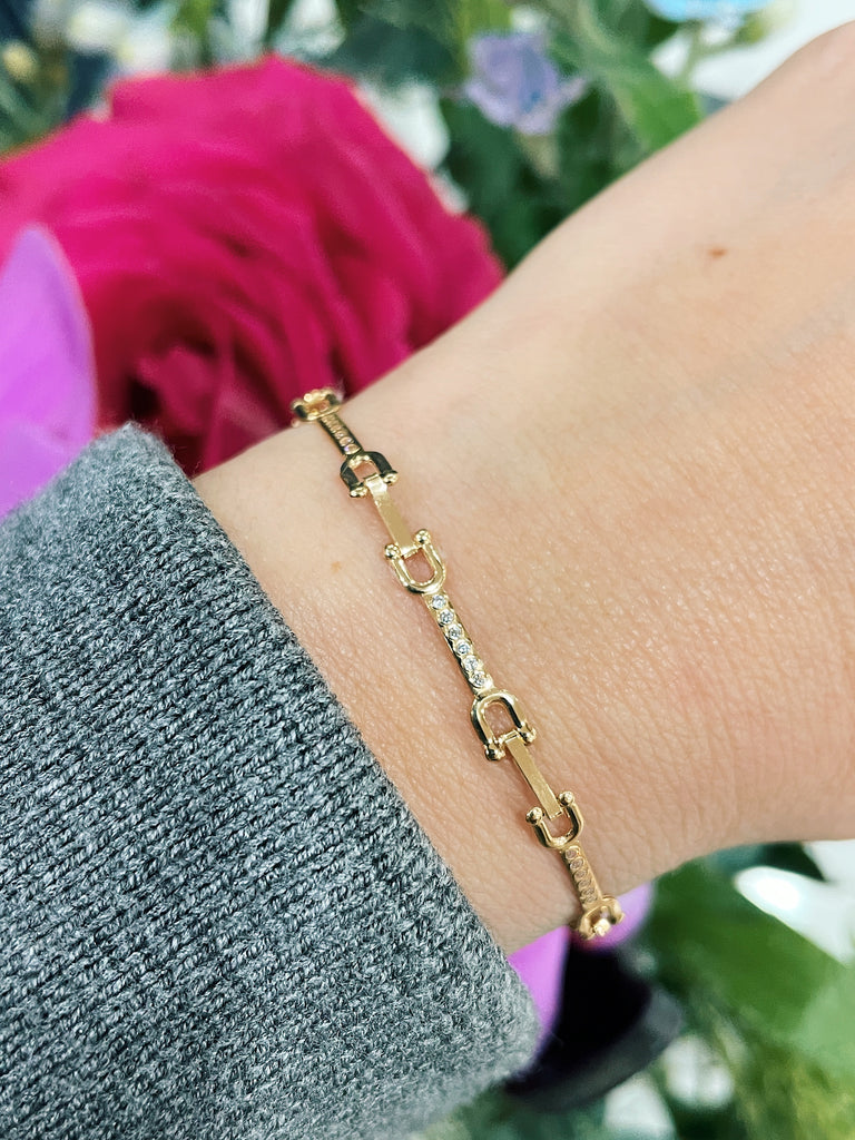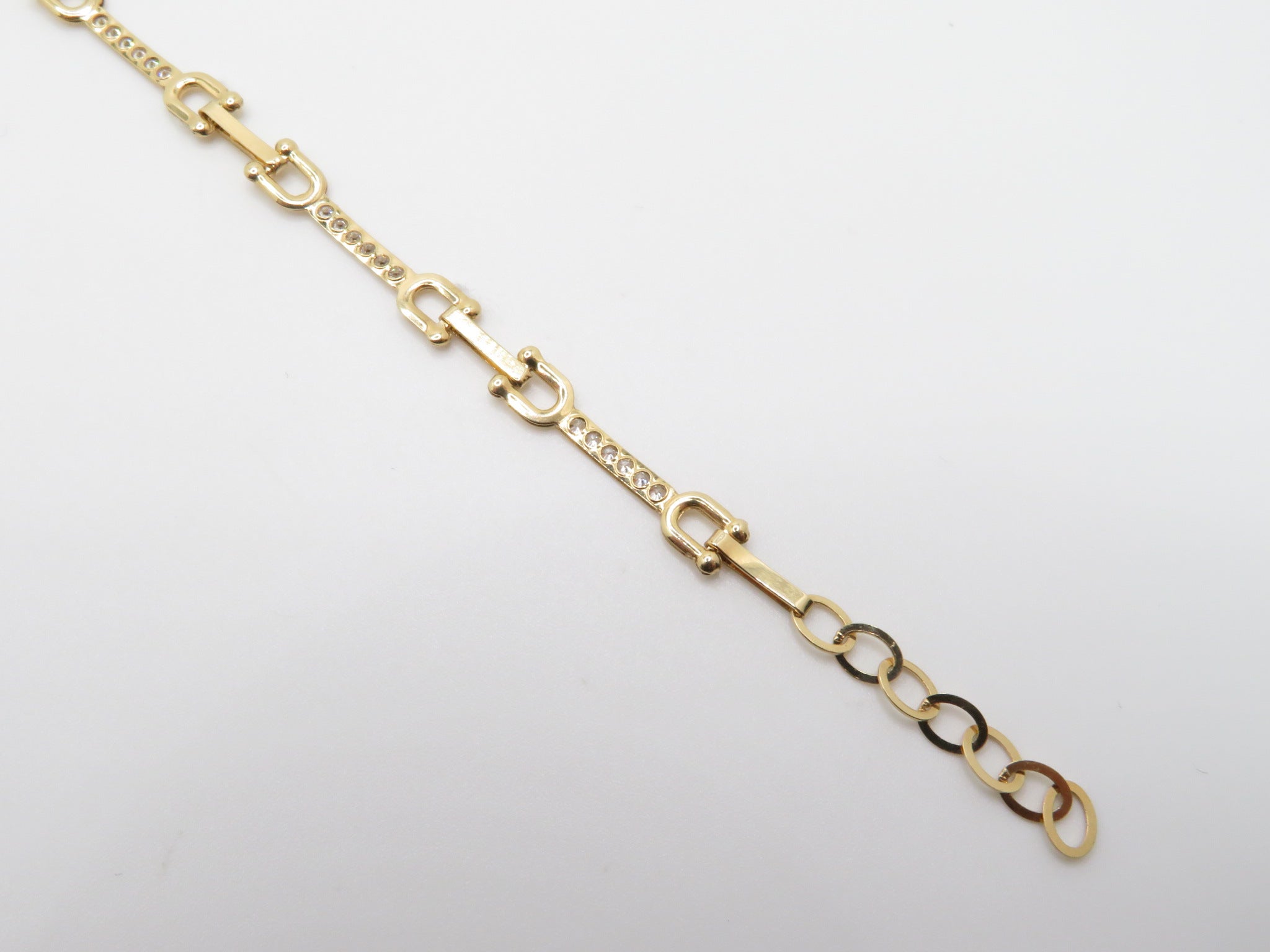 Formal and dainty, this stunning new 19.25k gold bracelet featuring an iconic horsebit pattern that is timeless and chic. Delicate cubic zirconia accents are stationed throughout the bracelet adding subtle sparkle without overwhelming the design. The adjustable extension chain allows you to find the perfect fit. A perfect new accessory to dress up.