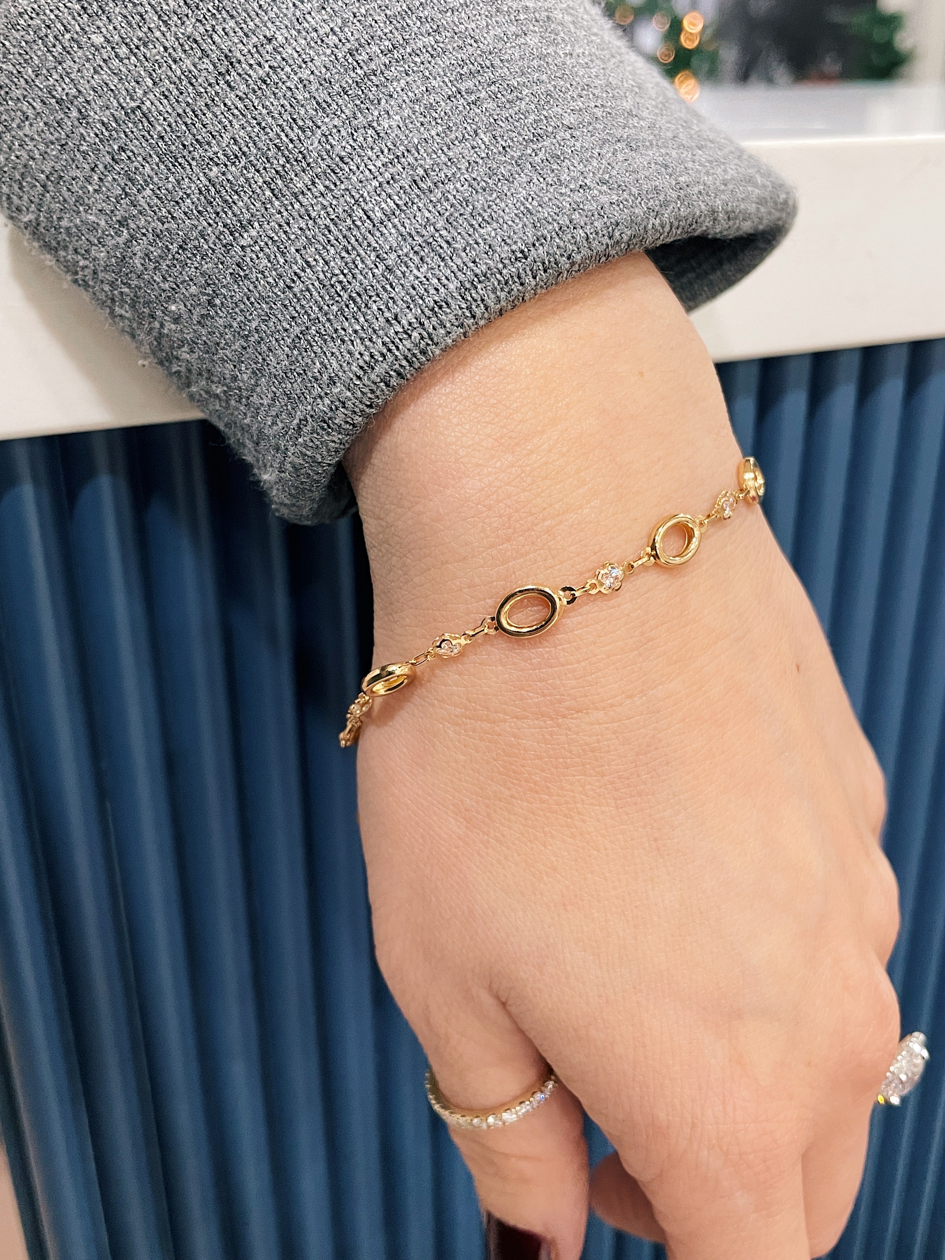 A delicate new arrival consisting of oval links and accented with cubic zirconia. Featuring daisy shaped bezels framing the cubic stations throughout. The extension chain lets you customize the fit to your preference, making it the perfect accessory for layering or wearing solo.