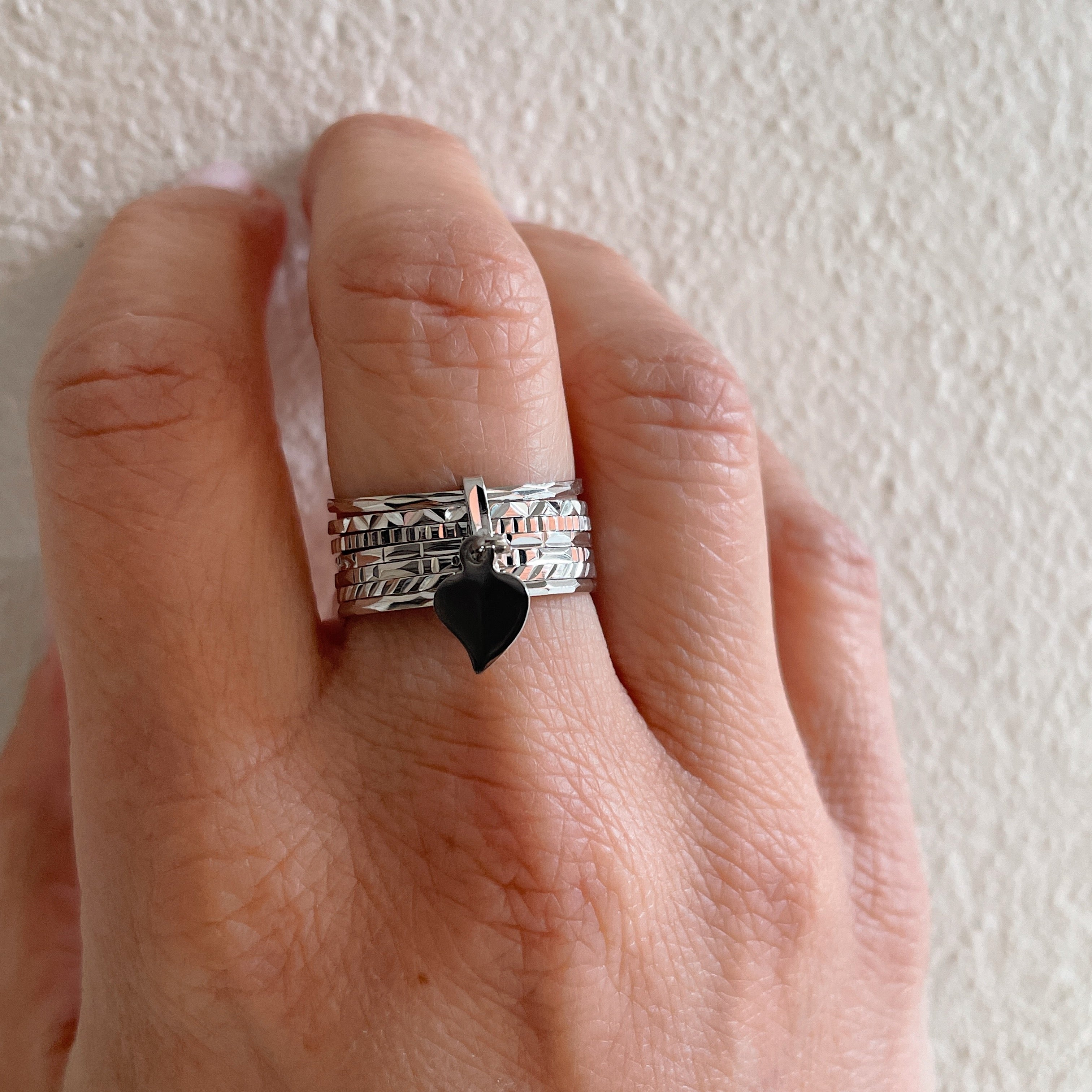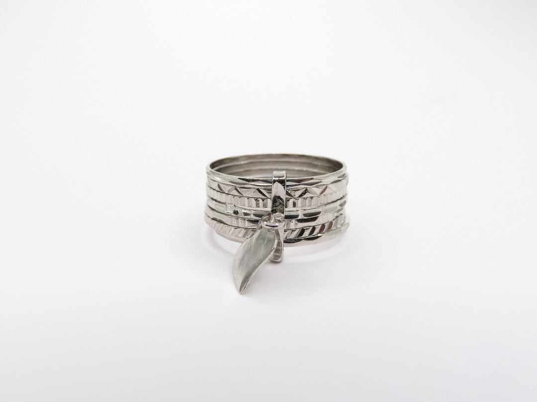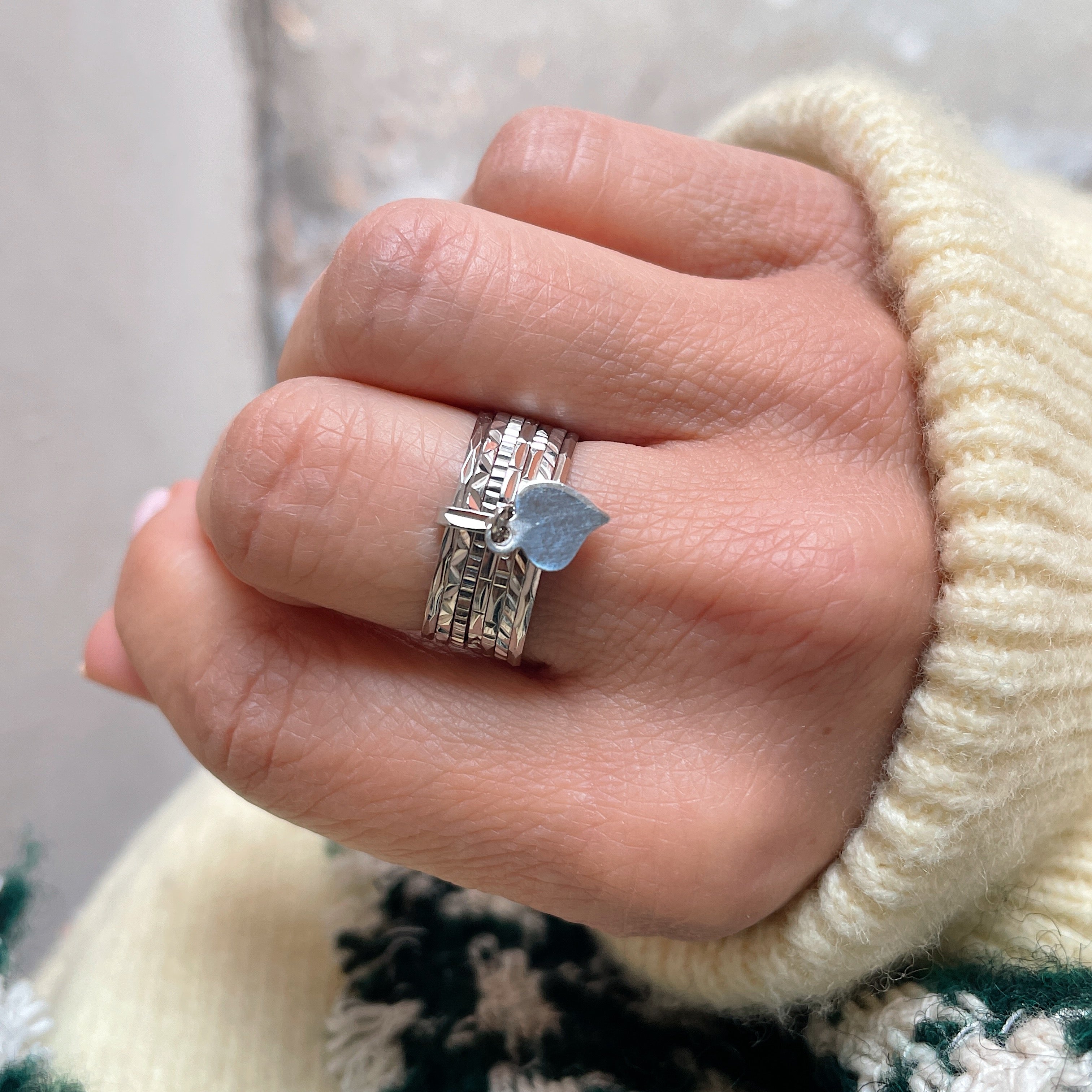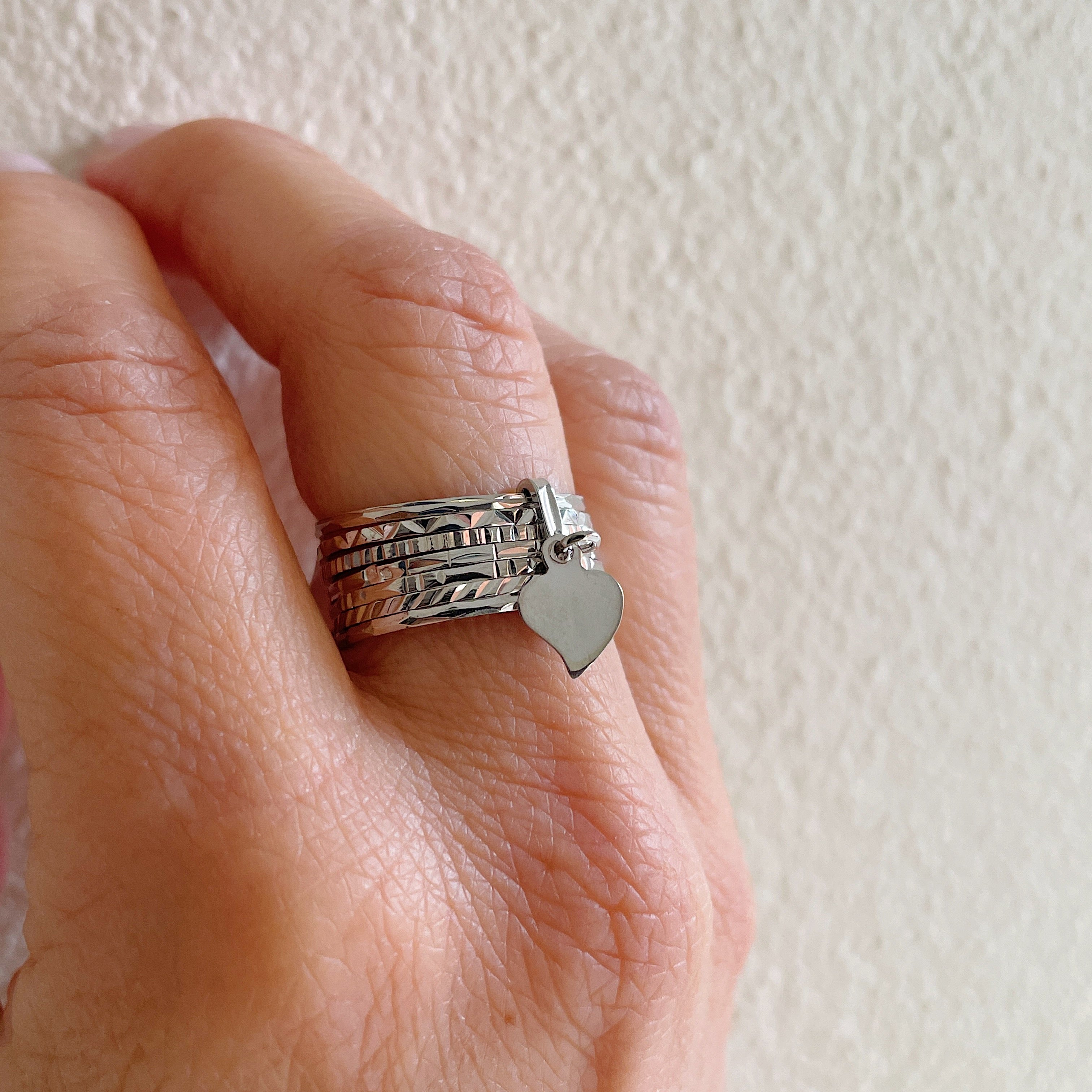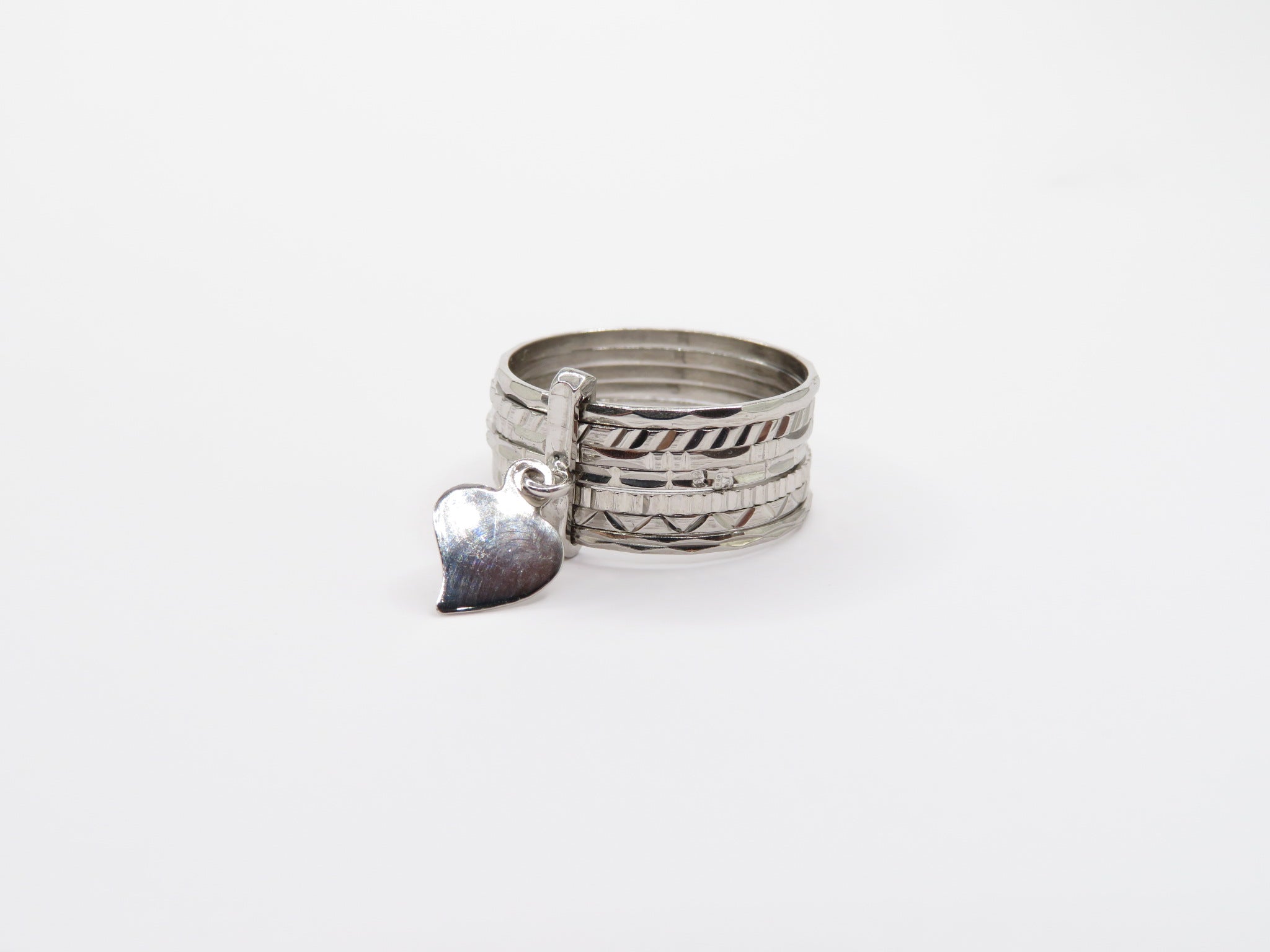 This traditional Portuguese Seven Day ring also known as the "Anel Sete Dias", consist of seven, uniquely textured bands. Each band is made to symbolize a day of the week and are held together by a single bar of silver. This sterling silver ring is finished with Rhodium plating for luxe high polished and shiny look.  The classic heart charm dangles from the centre bar and celebrates true love and happiness.  This design is also available as a  Seven Day Bangle.