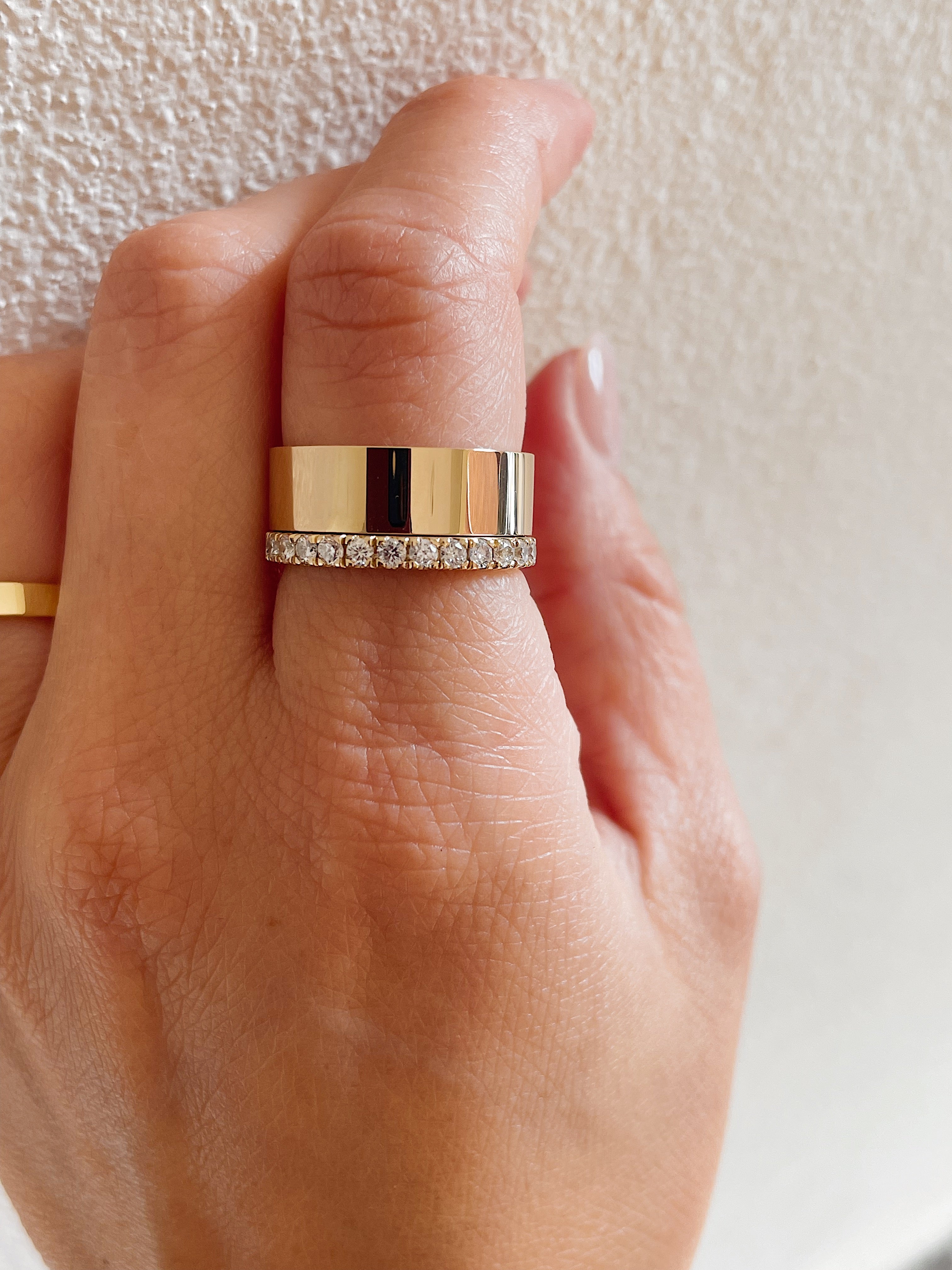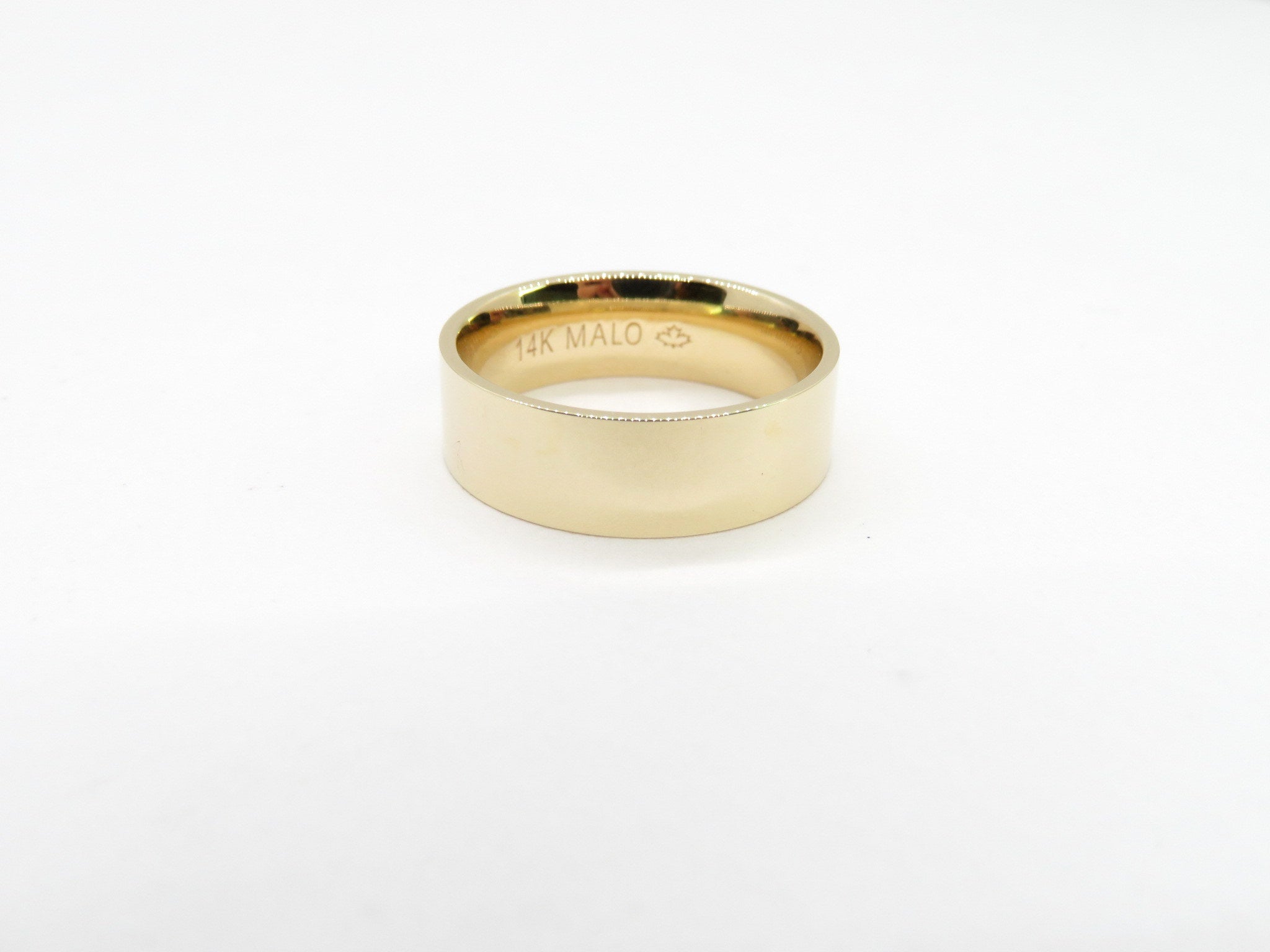 The modern version of the classic wedding band, this Cigar Style Band consists of a polished flat finishing. A popular choice because of it's wide width, this band can be used as a wedding band or as a casual gold ring. Great for stacking or worn solo, the cigar band gets its name by mimicking the label found on a cigar.